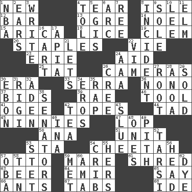ACROSS 1. ___ Haven, CT 4. Pull apart 8. Capri or Wight 12. Long, evenly shaped piece 13. Legendary monster 14. Christmas carol 15. N. Chile seaport 18. Louse (plural) 19. Clement's nick name 20. Paper fasteners 22. Compete 23. One of the Great Lakes 24. Assist 25. Make lace 26. Devices for capturing images 30. Period 33. Father Junipero _ 36. Words to Nanette 37. Auction offers 39. Actress Charlotte 40. Utensil 41. Double curve, resembling the letter S 42. Drinks excessively 44. Bit 45. Fools 47. Chop off 50. Santa ___, CA 51. A single undivided whole 53. R.R. building 54. Leopard's kin 57. Von Bismarck 59. Female horse 61. Tear up 63. Fermented drink made from hops 64. Independent ruler or chieftain 65. Declare 66. Pismires 67. Bar bills 68. Binary compound DOWN 1. Basketball assoc. 2. Hearing organs 3. Compose 4. Lacquered or enameled metalware 5. Armor plate that protects the chest 6. Curve 7. To sift 8. Event 9. Flatfish 10. Area sheltered from the wind 11. Shade tree 16. Draw slowly or heavily 17. Capital of Western Samoa 21. Allows 22. Zeal 24. American Automobile Association (abbr.) 26. Algonquian 27. Carrot, for example 28. Small Philippine buffalo 29. Exchanged or delivered for money 30. Inky black, to poets 31. Swiss mountan, "Queen of the Mountains" 32. Arabian gulf 34. Greek god of love 35. Strike 38. Legislators 42. Beverage made from leaves 43. Turn sharply 46. _ tizzy (2 wds.) 48. Washington bills 49. Heart or essence 52. Tarsus (plural) 53. Proofreading order 54. Baby bed with high sides 55. Possessive pronoun 56. Froth on beer 57. Chief or king in Benin or Nigeria 58. "___ Little Indians" 59. Was introduced to 60. Housemaid (var.) 62. Color