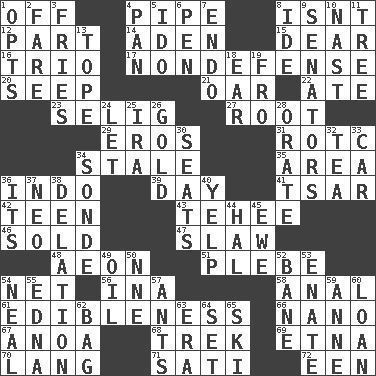 ACROSS 1. Not in operation 4. Corncob 8. Is not 12. Component 14. An important port of Yemen 15. Letter starter 16. Musical group of three 17. Unrelated to defense, as in spending 20. Ooze 21. Rowing implement 22. Had dinner 23. Major League Baseball Commissioner Bud 27. Carrot, for example 29. Greek god of love 31. College mil. group 34. Showing deterioration from age 35. Type of rug 36. Southeast Asian peninsula 39. 24 hours 41. Russian ruler of old 42. Adolescent 43. Giggle 46. Exchanged or delivered for money 47. Cole _ (cabbage dish) 48. A really long time 51. First-year military academy student 54. Fish or hair follower 56. _ tizzy (2 wds.) 58. Of or related to the anus 61. The property of being fit to eat 66. Billionth: prefix 67. Small Philippine buffalo 68. Long journey 69. Inactive volcano in Sicily 70. Long (Scottish) 71. Suttee (variant) 72. Car or cant ending DOWN 1. Chooses 2. Conductor's collection 3. Strips of potato fried in deep fat 4. Baking dish 5. Wedding promise 6. Animal enclosure 7. Inside; within (prefix) 8. Binary compound 9. Legislators 10. Political cartoonist Thomas 11. Woody plant 13. Drink excessively 18. Ewer handle 19. From 24. Allow 25. Retirement account (abbr.) 26. Precious metal 28. Speak pompously 30. Theater features 32. Beverage made from leaves 33. Automobile 34. Message 36. It is 37. Modern: prefix 38. Accusation by an informer 40. Sharp bark 44. Actor Linden 45. She-sheep 49. Lubricate 50. Compass dir. 52. Object of repulsion 53. Maternal 54. Be tempered by heat 55. Pulitzer Prize-winning author Ferber 57. Pismires 59. Singer Murray 60. Grant temporary use of 62. Container for groceries 63. Epoch 64. Arrange properly for use 65. What Jean-Claude Killy likes to do