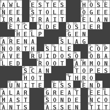 ACROSS 1. Leather borer 4. _____ Park, CO 9. Stockings 13. Born 14. Fur scarf 15. Double curve, resembling the letter S 16. Retirement account (abbr.) 17. Distinguishing feature 18. Liveliness 19. And so on (abbr.) 21. Binary compound 22. Flexible twig of a willow tree 24. Aid 26. Commissioned military rank (abbr.) 27. Sports stadium 29. Volcanic refuse 30. _ pole 31. Filth; sediment 33. Police officer (slang) 36. "___ Maria" 37. Boisterous (Brazilian Portuguese) 40. Chief or king in Benin or Nigeria 41. Directed 42. Carrot, for example 43. ID or VA city 45. Examine minutely or intensely 47. Drinks excessively 48. Being at a high temperature 49. Through, poetically 50. Join together 52. Curvy letter 54. Conclusion 56. Having or resembling wings 57. Relatively large 59. Snakelike fish 61. Vertical spar for supporting sails 62. Something which is sent 63. Non-commissioned officer (abbr.) 64. Pismires 65. NE Netherlands city 66. Teat (slang) DOWN 1. Cuckoo 2. We are 3. Tough but pliablecoriaceous 4. Eastern Standard Time (abbr.) 5. Long narrow piece of something 6. Frog relative 7. Writer Wiesel 8. Arrange properly for use 9. Cultivating 10. Stare 11. Burn superficially 12. Car or cant ending 20. Penny 22. Stares 23. Ocean 25. Cowardly lion portrayer 27. Of or related to the anus 28. Be footloose 29. Slit 31. The Jewish people; Israel 32. Wedding promise 33. Piece 34. Mitch Miller's instrument 35. Zero-star reviews 38. A salt of uric acid 39. Pledge 44. Greater amount 45. Upper-body garments 46. Small bed 49. Sadhe (variant) 50. Uhlan (variant) 51. Political cartoonist Thomas 52. Greek god of love 53. Elected reps. 55. Tenth: prefix 56. Wet nurse (var.) 57. Girls' org. (abbr.) 58. "___ Little Indians" 60. Car dealer's back yard