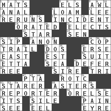 ACROSS 1. Floor coverings 5. Raised railways 8. Leather borer 11. Of or related to the anus 12. Rich soil 13. Area sheltered from the wind 14. Summer TV shows 17. Event 19. Declaimed 21. Opts 22. Play the lead 23. Elected rep. 24. Small drink 27. At once, immediately (arch.) 29. Police officer (slang) 32. Hang back 34. Two (Sp.) 36. Celtic language 37. 90 degrees 38. Eastern Standard Time (abbr.) 39. Set of matching outer garments 40. Singer James 41. Ocean 42. Postpone 43. To separate or throw off 44. The founder of a family 46. Three (prefix) 47. Parent Teacher Association (abbr.) 50. College mil. group 52. A viewer who gazes fixedly 55. Michaelmas daisies 57. News announcer 59. Threatening words 62. It is 63. Drop; flow; fall 64. Ache 65. Observe 66. Snakelike fish 67. Jane of fiction DOWN 1. Impair 2. One (Scot) 3. Pacific island yam 4. Runs notes together 5. Period of immesurable duration 6. Shoestrings 7. Grin 8. Actor Baldwin 9. Left 10. Allows 12. Flaplike covering 15. Relating to or accompanying birth 16. Comedian Laurel of Laurel & Hardy 18. Lair 20. Eats (away) 24. Navigate 25. Feeling or showing extreme anger 26. Thick mixture 28. Olfactory organs 29. An unpleasant substance 30. Flexible twig of a willow tree 31. _ dish (used to culture cells) 33. Call ___ day 35. Flight of steps 36. Compass dir. 42. Prevent from occurring 45. Printing process, for short 47. Adept person 48. Laconic 49. Nick name for Arthur 51. Streamer paper 52. Indian titles of respect 53. False hair 54. Domed church section 55. "We ___ not amused" (Victoria) 56. Kill 58. Pipe bend 60. Title for a knight 61. Compass dir.