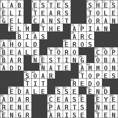 ACROSS 1. Experiment locale 4. _____ Park, CO 9. "______ My Girl" (Turtles hit) 13. Connecticut Ivy Leaguer 14. Separates forcefully 15. Lacquered or enameled metalware 16. Set 17. 2nd pers. sing. pres. of can (arch.) 18. NW Algerian seaport 19. Shade tree 21. Definite Article 22. Bee-related 24. Prejudice 26. Curve 27. Hold, grip (Informal) 29. Greek god of love 30. Memphis, Tenn. Street 31. "Corrida" creature 33. Police officer (slang) 36. Soap unit 37. Inhabiting a nest 40. Chief or king in Benin or Nigeria 41. Find the sum of 42. Nathan's nickname 43. ID or VA city 45. Fly high 47. Drinks excessively 48. Teat (slang) 49. Make new 50. Peak District village in England 52. Compass dir. 54. Conclude 56. The sixth month of the Jewish calendar 57. Desist 59. Sight organ 61. French philosopher Descartes 62. Pieces 63. Compass dir. 64. Engineer (abbr.) 65. Ascend 66. "___ Little Indians" DOWN 1. Part of a journey 2. Toward shelter 3. Big road sign 4. And so on (abbr.) 5. Theater features 6. Hyperbolic tangent 7. Celtic language 8. Fast jet (abbr.) 9. Unemotional ones 10. Israeli folk dance 11. Style 12. Elected rep. 20. Place where flour is made 22. Composer Copland 23. Adept person 25. Arabian gulf 27. Swedish rock group 28. Froth on beer 29. 4th largest of the Great Lakes 31. Russian ruler of old 32. Baseball player Mel 33. Part 34. Mitch Miller's instrument 35. Zero-star reviews 38. Related on the mother's side 39. Yard entry 44. Method 45. A viewer who gazes fixedly 46. Lubricate 49. Musical pauses 50. Paradise 51. Mild oath, euphamism for damn 52. Burn superficially 53. Indian skirt 55. Centimeter-gram-second unit of force 56. "We ___ not amused" (Victoria) 57. Tax preparer (abbr.) 58. Compass dir. 60. Car or cant ending