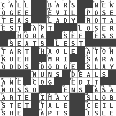 ACROSS 1. Give a ring to 5. Soap units 9. ___ Haven, CT 12. Double curve, resembling the letter S 13. Tending to cause great harm 14. Introduce or present, as a question 15. Afternoon social gatherings 16. Kenny Rogers chart-topper in '80 17. Roll call or roster of names 18. Eastern Standard Time (abbr.) 19. Fitting 21. Failure 22. Israeli folk dance 24. Perceive with the eye 26. Double-curved letter 27. Theater features 28. For fear that 29. Small pie 30. White Person, in Hawaii 32. Smallest unit of an element 36. Malaysian steamed pastry 37. Medical imaging device (abbr.) 38. "Two Mules for Sister ____" 39. Likelihood 40. Evade 42. Kill 43. Religious women 44. Allots cards 46. A saturated hydrocarbon 49. Gear tooth 50. Prepare for publication 51. With motion or animation 53. Followers of ems 54. White ___ sheet 57. Johnson of "Laugh-In" 58. "If ____ say so..." 61. Messy guy 62. Proofreading order 63. Story 64. To provide with a ceiling 65. A female animal or person 66. Tenement units (abbr.) 67. Capri or Wight DOWN 1. ____ d'Azur (French Riviera) 2. Ripens 3. Tough but pliablecoriaceous 4. French article 5. Waist strap 6. Actress Gardner 7. To free from 8. Playfully artful 9. Trap for birds or small mammals 10. _____ Park, CO 11. Erodes 14. Adept person 19. Tate display 20. Romantic infatuation 21. Allow 23. Curses 24. Major League Baseball Commissioner Bud 25. Compass dir. 27. Saudi Arabian king (1953-1964) 28. Nobles 29. Ring climax 31. Amid 32. Slender Brazilian palm 33. Baron Munchausen's specialties 34. Mouths or openings 35. Fifth month 40. Superhero pair 41. Paradise 43. Non-commissioned officer (abbr.) 45. Begley and Asner 46. Collect or gather 47. Compass direction 48. First name in cosmetics 52. Put into a specified state 53. Snake ____ (dice throw) 55. The visible part of the earth's surface 56. Competent 58. Call ___ day 59. Atlas unit 60. The first octave above the treble staff 61. _-fi