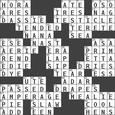 ACROSS 1. Israeli folk dance 5. Had dinner 8. Bear (Spanish) 11. Ancient Greek god of war 12. Angers 13. Tired old horse 14. Hyrax 17. One of the two male reproductive glands 19. Watched over 21. Cylindrical with tapered ends 22. Nanny 23. Ocean 24. Compass dir. 27. Political cartoonist Thomas 29. White ___ sheet 32. Nest on high 34. Period 36. Demure 37. Tear apart 38. Pet locale 39. Singer James 40. Singer Brickell 41. Small drink 42. Frees from moisture 43. Color 44. Separate forcefully 46. Curvy letter 47. Shoshoni 50. The sixth month of the Jewish calendar 52. Went by 55. Window treatments 57. Electrical Measurement 59. Ear of corn 62. Sliced dessert 63. Cole _ (cabbage dish) 64. Calm and collected 65. Say or write further 66. Car or cant ending 67. Coop moms DOWN 1. Possessed 2. Mouth or opening 3. State of inaction 4. NE Netherlands city 5. "We ___ not amused" (Victoria) 6. Trials 7. First name in cosmetics 8. Single time 9. Table seasoning 10. Double curve, resembling the letter S 12. It would 15. Silly 16. Pulitzer Prize-winning author Ferber 18. Lyricist Gershwin 20. Artist's stands 24. Having ears or earlike features 25. Morally degraded 26. Bert's buddy 28. Distinguishing feature 29. Nick name for Arthur 30. Locates 31. Collect or gather 33. Binary compound 35. Seem 36. For each 42. Window treatment 45. First of billions? 47. Purpose 48. Laconic 49. Peak District village in England 51. Arrive at 52. Dad 53. Among 54. Moved rapidly 55. Morning condensation 56. _ gin 58. Separate the seeds from cotton 60. Electrically charged atom 61. Raised railways