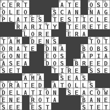 ACROSS 1. Sure thing 5. Had dinner 8. Bear (Spanish) 11. Margarine 12. Examine hastily 13. Tired old horse 14. Food holders 17. One of the two male reproductive glands 19. Noteworthy scarcity 21. Cigar-shaped 22. Old wives' tales, e.g. 23. Epoch 24. Scottish cap 27. Lairs 29. Small child 32. Speak pompously 34. Heredity factor (abbr.) 36. Moves up and down 37. Went 38. Greek goddess of the dawn 39. Capital of Western Samoa 40. Toward the sea 41. Two (Sp.) 42. A special lineage 43. Put into a specified state 44. Become fatigued 46. Compass dir. 47. Housemaid (var.) 50. Oceans 52. Declaimed 55. Ringlike coral islands and reefs 57. Conveyance 59. Manatee 62. Compass dir. 63. Round or rotation of duties 64. Object of repulsion 65. Observe 66. Eastern Standard Time (abbr.) 67. Proofreading order DOWN 1. Police officer (slang) 2. Pipe bend 3. Posterior 4. Add up to 5. Adept person 6. Clothes sense 7. Keyboard key 8. At one time in the past 9. Table seasoning 10. Double curve, resembling the letter S 12. Filthy place 15. Eat (away) 16. Male parent of an animal 18. Lyricist Gershwin 20. Looked after 24. Ancient Roman robes 25. Came up 26. French painter Edouard 28. Snout, nose 29. Drinks excessively 30. Off-Broadway awards 31. Sadhe (variant) 33. Afternoon social gathering 35. Help 36. Long, evenly shaped piece 42. Memphis, Tenn. Street 45. Vintage cars 47. _ moment's notice (2 wds.) 48. Distance measurement (Brit.) 49. Goodbye (Sp.) 51. Thick slices 52. Lyric poems 53. French philosopher Descartes 54. Toward shelter 55. Santa ___, CA 56. Scram! 58. Baseball player Mel 60. Single 61. Dripping