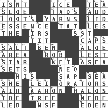 ACROSS 1. Is not 5. Frozen water 8. Afternoon social gathering 11. A type of plum 12. Small boys 14. Increase 15. Plunders 17. Entertaining tales 18. Hat (slang) 19. Substance 21. Make lace 22. French article 23. Definite Article 24. Big collection agency 25. Fast jet (abbr.) 27. Teat (slang) 28. Smile enhancers 31. Table seasoning 35. Benjamin's nick name 37. _ vera 38. Length times width 39. Director Reiner 41. For fear that 42. Play the lead 43. Soggy 45. At sea 46. Arranges properly for use 47. Modern: prefix 49. Part of HMS, perhaps 51. Plant excrement 52. Ocean 55. A female animal or person 57. Flowery wreath 60. Speakers 62. Atmosphere 63. Composer Copland 65. Rings 66. Binary compound 67. Not kosher 68. Ancient Persian 69. Directed 70. Overdraft (abbr.) 71. Paradise DOWN 1. Small island 2. Agitate, as a liquid 3. Trap for birds or small mammals 4. Wig 5. Call ___ day 6. Haul 7. Pulitzer Prize-winning author Ferber 8. Baron Munchausen's specialties 9. Singer Brickell 10. Sums up 13. Fast planes 16. In a ____ (agitated or irritated) 17. Next before 20. Baby bed with high sides 26. Any of the three canals of the cochlea 29. Airs 30. Stalk of a moss capsule 31. Backtalk 32. Johnson of "Laugh-In" 33. Resembling or made to resemble leather 34. Tarsus (plural) 36. Immediately 40. Gillaume's butler role 44. Rend 48. Brightly colored fish 50. Narrow board 52. Having a sole or soles 53. Eat (away) 54. NE Netherlands city 55. Travel by water 56. Flintstone garb 58. Merit 59. Angers 61. Not wild 64. Not in operation