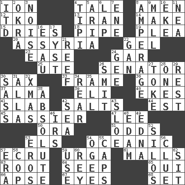 ACROSS 1. Electrically charged atom 4. Falsehood 8. So be it 12. Ring climax 13. SW Asia republic 14. Create 15. Frees from moisture 18. Corncob 19. Entreaty 20. Nineveh was its capital 22. Set 23. Comfort 24. Slender fish 25. Shoshoni 26. Legislator 30. Saxophone 33. Movie unit 36. Went 37. _ mater 39. Connecticut Ivy Leaguer 40. Makes supply last 41. Thick slice 42. Table seasonings 44. Eastern Standard Time (abbr.) 45. More lively and spirited 47. Area sheltered from the wind 50. Mouth or opening 51. Probability 53. Raised railways 54. Pertaining to the sea 57. Shade of tan 59. Capital and largest city of Mongolia 61. Shopping centers 63. Carrot, for example 64. Ooze 65. Fr. "Yes" 66. Domed church section 67. Sight organs 68. Arrange properly for use DOWN 1. It would 2. Gumbo ingredient 3. Annoying sound 4. Native american tent (variation) 5. Operatic vocal solo 6. Infant locale 7. Compass dir. 8. Electrical Measurement 9. Shopping center 10. Make supply last 11. Teachers' org. 16. He sold his birthright 17. System (abbr.) 21. Coral ridge 22. Separate the seeds from cotton 24. Unit of force equal to gravity 26. Stricken, poetically 27. Casino tip 28. Singles 29. Repose 30. Backtalk 31. Silent film actress Nazimova 32. Dec. holiday 34. Tail end 35. 100% 38. Utter; complete 42. Ocean 43. _ gin 46. Big collection agency 48. Dutch treat 49. Pulitzer Prize-winning author Ferber 52. Grain storage towers 53. Greek god of love 54. Double curve, resembling the letter S 55. Balmoral and tarboosh 56. A slight indication 57. Period 58. Police officer (slang) 59. Purpose 60. Marina Del _, California 62. Be seated