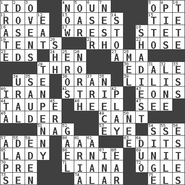 ACROSS 1. Wedding promise 4. Part of speech 8. Elect 11. Be footloose 13. Fertile tracts in a desert 15. Make a knot 16. At sea 17. Take or capture by force 18. Proofreading order 19. Portable shelters 21. 17th letter of the Greek alphabet 22. Stockings 23. Begley and Asner 24. Layer 27. Housemaid (var.) 29. Through, poetically 30. Peak District village in England 34. Purpose 36. Northwest Algerian city 39. Ms. Damita and namesakes 40. SW Asia republic 41. Long narrow piece of something 43. Immeasurably long periods of time 44. Grayish beige 46. The bottom of a shoe or boot 47. Observe 48. Tree or shrub in the Birch family 49. Patter 51. Tired old horse 53. Sight organ 54. Compass dir. 57. An important port of Yemen 60. American Automobile Association (abbr.) 63. Proofreads 65. Kenny Rogers chart-topper in '80 66. Bert's buddy 69. A single undivided whole 70. Before (prefix) 71. Woody, climbing, usually tropical plant 72. Stare at amorously 73. Elected rep. 74. Having or resembling wings 75. Raised railways DOWN 1. Feeling or showing extreme anger 2. Administered medicine 3. Baking chambers 4. At this time 5. Rowing implement 6. One who makes use of a thing 7. Tender 8. Von Bismarck 9. Sliced desserts 10. False hair 12. Consume 14. Portico 18. Most dark, concealed or hidden 20. Quiet! 25. Greek god of love 26. _ pole 28. Cartoonist voice _ Blanc 29. 3-inch nail 31. _ vera 32. Actor's bit 33. Curvy letter 34. Mountain range 35. Saudi Arabian king (1953-1964) 37. "We ___ not amused" (Victoria) 38. Sibling's daughter 40. Call ___ day 42. Live dramatic performance 45. Epoch 50. Born 52. Highlander 54. Scorch 55. Free from disturbance or agitation 56. _____ Park, CO 57. High mountains 58. Have the gumption 59. Locale of original sin 61. Roberta Peters solo 62. Of or related to the anus 64. Superhero pair 67. _ tizzy (2 wds.) 68. Hearing organ