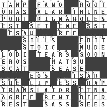 ACROSS 1. Pack (down) 5. Papal veil 9. Carrot, for example 13. Mouths or openings 14. Having or resembling wings 15. One or ones belonging to thee 16. Left side of a ship or aircraft 17. Complicated, petty procedures 19. Eastern Standard Time (abbr.) 20. Arrange properly for use 21. She-sheep 22. Fast jet (abbr.) 23. Son of Isaac 25. To sift 26. Beverly of Met fame 30. Prepare for publication 34. Unemotional 35. Naked 36. Farming town in central California 39. Separates forcefully 42. Within a short period 43. Greek god of love 44. Taiwanese island in East China Sea 46. Scram! 47. Gospel singer Marvin 48. Greek goddess of the dawn 51. Russian ruler of old 54. Institute legal proceedings 57. Mouth edge 58. Curvy letter 60. Reproach for some lapse or misdeed 62. Interpreter 65. Inactive volcano in Sicily 66. Match 67. Painter Guido (1575-1642) 68. Passed on 69. Relief 70. Backtalk 71. Perceives with the eye DOWN 1. Drink excessively 2. Came up 3. Shops 4. Pacific Standard Time (abbr.) 5. Conductor's collection 6. Came down and settled, as after flight 7. Tired old horse 8. Abalone 9. 17th letter of the Greek alphabet 10. Lubricates 11. Singles 12. Trial 15. Relationship diagram 18. Deep reverence 20. Set or collection 24. Help 27. Car dealer's back yard 28. Falsehood 29. Fraudulent business schemes 30. Follows as a consequence or result 31. Superhero pair 32. Wedding promise 33. "___ Little Indians" 36. French article 37. The grampus (Milton) 38. ___ good deed 40. Actress Charlotte 41. R.R. building 45. Fast planes 48. Otherwise 49. Lubricate 50. Practice fights 52. Nick name for Arthur 53. The wife of a rajah (variant) 54. Play the lead 55. Goad 56. Hearing organs 58. Immeasurably long periods of time 59. Indian titles of respect 61. Writing tablets 63. Fish or hair follower 64. Beverage made from leaves 65. Begley and Asner