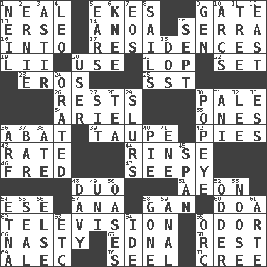 ACROSS 1. Be tempered by heat 5. Makes supply last 9. Yard entry 13. Celtic language 14. Small Philippine buffalo 15. Spanish missionary in California 16. To the inside or interior of 17. Homes 19. Cards in a Roman deck? 20. Purpose 21. Trim (branches) 22. Arrange properly for use 23. Greek god of love 25. Fast jet (abbr.) 26. Musical pauses 30. Diluted with white 34. Satellite of Uranus 35. Singles 36. Blind as ____ 39. Grayish beige 42. Sliced desserts 43. Pace 44. Wash lightly 46. Flintstone 47. Oozy 48. Superhero pair 51. Period of immesurable duration 54. Compass dir. 57. Santa ___, CA 58. Separate the seeds from cotton 60. ___ good deed 62. Household entertainment appliance 65. Scent 66. Characterized by obscenity 67. Pulitzer Prize-winning author Ferber 68. Repose 69. Actor Baldwin 70. Sew up the eyelids of hawks and falcons 71. Algonquian DOWN 1. Famous astronaut Armstrong 2. Bert's buddy 3. Moving or stirring 4. Lion 5. Hearing organs 6. Leg joint 7. Greek goddess of the dawn 8. Moves on water 9. Commissioned mil. rank 10. Curves 11. Woody plant 12. 90 degrees 15. Back-to-school mo. 18. Two (Sp.) 20. One who makes use of a thing 24. Declaimed 27. Be seated 28. Beverage made from leaves 29. Disparaging remarks 30. Wimpy's pal 31. Black tropical American cuckoo 32. Area sheltered from the wind 33. Curvy letter 36. Sandy's bark 37. Soap unit 38. Had dinner 40. Sliced dessert 41. Compass dir. 45. Connect, as a bridge 48. _ Jones' Locker 49. Corn or form start 50. Fertile tracts in a desert 52. More peculiar 53. Trap for birds or small mammals 54. Inactive volcano in Sicily 55. Lick closed 56. Otherwise 58. Went 59. Of or related to the anus 61. Johnson of "Laugh-In" 63. And so on (abbr.) 64. Binary compound 65. The grampus (Milton)