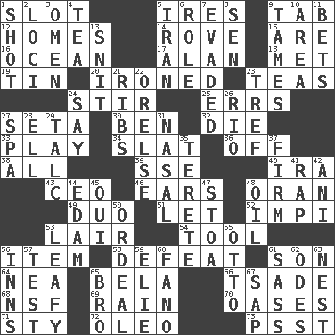 ACROSS 1. Narrow, elongated depression 5. Angers 9. Bar bill 12. Residences 14. Be footloose 15. "We ___ not amused" (Victoria) 16. Sea 17. ____ Jay Lerner 18. Was introduced to 19. Metal container 20. Pressed 23. Afternoon social gatherings 24. Commotion 25. Blunders 27. Bristle 30. Benjamin's nick name 32. Pass on 33. Frolic 34. Narrow board 36. Below a satisfactory level 38. Everything 39. Compass dir. 40. Lyricist Gershwin 43. Corporate head (abbr.) 46. Hearing organs 48. Northwest Algerian city 49. Superhero pair 51. Allow 52. Body of Kaffir warriors 53. Den 54. Implement 56. A distinct part 58. Outscore 61. Manchild 64. Teachers' org. 65. Actor Lugosi 66. Sadhe (variant) 68. Overdraft (abbr.) 69. Water falling in drops from the sky 70. Fertile tracts in a desert 71. Filthy place 72. Butter sub 73. Inconspicuous attention getter DOWN 1. Opportunity 2. Event scenes 3. Sign of something about to happen 4. Afternoon social gathering 5. SW Asia republic 6. Hero or heavy, e.g. 7. Eluded 8. Elected rep. 9. Softens 10. Length times width 11. Antes 13. In a ____ (agitated or irritated) 21. Chest bones 22. Threatening words 23. Not kosher 24. Declare 26. River (Sp.) 27. Health resort 28. Pipe bend 29. Baby powder 31. Rhinal 35. Cigar-shaped 37. Not soft or yielding to pressure 41. Reproach for some lapse or misdeed 42. Black tropical American cuckoo 44. Dutch treat 45. Fr. "Yes" 47. Portico 48. Lubricate 50. Severe or trying experience 53. Like summer trees 55. "Beetle Bailey" pooch 56. Taverns 57. Trial 59. Writer Wiesel 60. Papal veil 61. Backtalk 62. Lyric poems 63. Egg locale 65. Sis' sibling 67. Plant excrement