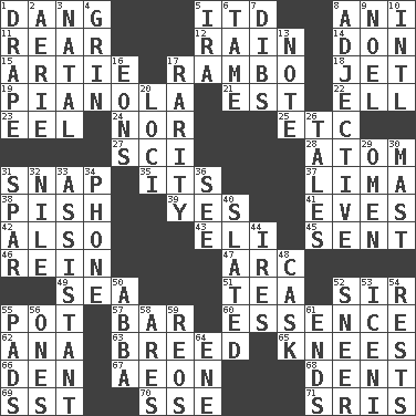 ACROSS 1. Mild oath, euphamism for damn 5. It would 8. Cuckoo 11. Located in or toward the back 12. Precipitation 14. Spanish title 15. Nick name for Arthur 17. Role for Stallone 18. Passenger plane 19. Player piano 21. Eastern Standard Time (abbr.) 22. Pipe bend 23. Snakelike fish 24. Not either 25. And so on (abbr.) 27. _-fi 28. Tiny particle 31. Fastener 35. It is 37. Pale green bean 38. Expression of disdain 39. Affirmative reply 41. Nights before holidays 42. In addition 43. Biblical high priest 45. Emitted 46. It's straight from the horse's mouth 47. Curve 49. Ocean 51. Afternoon social gathering 52. Title for a knight 55. Plant holder 57. Oblong piece of solid material 60. Core 62. Santa ___, CA 63. A special lineage 65. Leg joints 66. Lair 67. A really long time 68. Undesirable depression on a surface 69. Fast jet (abbr.) 70. Compass dir. 71. Indian titles of respect DOWN 1. Window treatment 2. Nest on high 3. Relating to or accompanying birth 4. Smile widely 5. Retirement account (abbr.) 6. Not wild 7. Rights 8. Descriptive word 9. Christmas carol 10. International (abbr.) 13. Make mention of 16. Immeasurably long periods of time 17. Noteworthy scarcity 20. Locales 26. Stories 29. Sign of something about to happen 30. Vertical spar for supporting sails 31. Coast Guard woman 32. The longest river in the world 33. Aide 34. Give a jingle 36. Perceive with the eye 40. Scheduled 44. Angers 48. Keg 50. Swedish rock group 52. Scornful expression 53. Ancient Celtic tribe of eastern Britain 54. Musical pauses 55. Groovy apts. 56. Singles 58. Ancient Greek god of war 59. Vintage cars 61. Extremities 64. Compass dir.