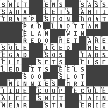 ACROSS 1. Stricken, poetically 5. Followers of ems 8. Backtalk 12. "Two Mules for Sister ____" 13. Allows 15. Against 16. _____ steamer (cargo ship) 18. The Jewish people; Israel 19. Water vessel 20. Writing tablet 22. Of or relating to Laos or its people 24. Flair 26. Acquire through effort 27. Do over again 28. Was introduced to 29. "We ___ not amused" (Victoria) 32. Not divided or shared with others 35. On the rocks 37. Teachers' org. 38. Mild oath 39. Distress signal 40. Bar bills 41. Biblical high priest 42. Arranges properly for use 43. Otherwise 44. Directed 45. ___ a Wonderful Life 46. Snakelike fish 49. "Barney Miller" actor Jack 50. Notch 51. Fools 55. Medical imaging device (abbr.) 56. Periodic rise and fall of the sea level 57. Overturn; upset 59. Learning spot: Fr. 63. Toward shelter 64. In a ____ (agitated or irritated) 65. (Had) reclined 66. Put on (as clothing) 67. R.R. building 68. 4th largest of the Great Lakes DOWN 1. Fast jet (abbr.) 2. Impair 3. Retirement account (abbr.) 4. ________ with (broke a safety seal) 5. Raised railways 6. Famous astronaut Armstrong 7. Portico 8. Unit of acoustic absorption 9. Small Philippine buffalo 10. Comedian Laurel of Laurel & Hardy 11. Be seated 14. Overwhelmed 17. Diluted with white 21. Male parent 23. Teat (slang) 25. Annoying sounds 28. Makes clutter 29. Of or related to the anus 30. Confederate soldiers (slang) 31. Comfort 32. Stitch closed the eyes of (a falcon) 33. Stare at amorously 34. Put down 36. Small bed 40. One of the two male reproductive glands 42. Unemotional ones 45. Electrically charged atom 47. Shade tree 48. Old wives' tales, e.g. 49. Contemptuous expression 51. The longest river in the world 52. The main thing one is thinking about 53. Immeasurably long periods of time 54. Set or collection 56. The 23rd letter of the Hebrew alphabet 58. Parent Teacher Assoc. 60. Rowing implement 61. Cards in a Roman deck? 62. Compass dir.