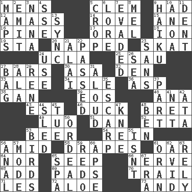 ACROSS 1. Not women's 5. Clement's nick name 9. Possessed 12. Collect or gather 14. Be footloose 15. One (Scot) 16. Abounding in pines 17. Taken by mouth 18. Electrically charged atom 19. R.R. building 20. Slept 23. Three-handed card game 24. Southern CA. univ. 25. He sold his birthright 27. Drinking establishments 30. White ___ sheet 32. Lair 33. Toward shelter 34. Capri or Wight 36. Cleo's killer 38. Separate the seeds from cotton 39. Greek goddess of the dawn 40. Santa ___, CA 43. Eastern Standard Time (abbr.) 46. Evade 48. Cy Young winner Saberhagen 49. Nilotic language 51. One of the 12 tribes of Israel 52. Singer James 53. Fermented drink made from hops 54. It's straight from the horse's mouth 56. Among 58. Window treatments 61. Rowing implement 64. Not either 65. Ooze 66. Effrontery 68. Increase 69. Groovy apts. 70. Drop behind 71. French article 72. Medicinal plant 73. "60 Minutes" Commentator Rooney DOWN 1. Atlas contents 2. Give off 3. Grandmother 4. Compass dir. 5. Riding implement 6. Old wives' tales, e.g. 7. Dodged 8. Cartoonist voice _ Blanc 9. Japanese poetic form 10. Small Philippine buffalo 11. Gouge 13. Synchronize (abbr.) 21. Jai _ 22. Went by 23. Without 24. Purpose 26. Ocean 27. Paper or plastic container 28. Chicken ___ king 29. French philosopher Descartes 31. Verbally 35. Fortification 37. Role in a play 41. Fish or hair follower 42. "One Day ___ Time" 44. Downhill vehicle 45. Third day of the wk. 47. Leg joint 48. Benjamin's nick name 50. Severe or trying experience 53. Avian creatures 55. Is not 56. Of or related to the anus 57. Method 59. Redecorate 60. Domed church section 61. Northwest Algerian city 62. Enthusiastic 63. Have confidence or faith in 65. Health resort 67. Epoch