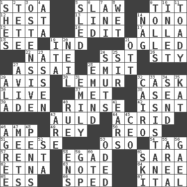 ACROSS 1. Portico 5. Cole _ (cabbage dish) 9. Teat (slang) 12. Command 13. Actor's bit 14. Words to Nanette 15. Singer James 16. Prepare for publication 17. Silent film actress Nazimova 18. Observe 19. Working for oneself (abbr.) 21. Stared at amorously 22. Nathan's nickname 24. Fast jet (abbr.) 26. Filthy place 27. Slender Brazilian palm 28. Send forth 29. Advice 30. Arboreal primate 32. Keg 36. Moving, as bait 37. Was introduced to 38. Toward the sea 39. Arabian gulf 40. Wash lightly 42. Is not 43. Old (Scot.) 44. Sour-tasting 46. Electrical Unit 49. Marina Del _, California 50. Vintage cars 51. Honkers 53. Bear (Spanish) 54. Label 57. Monthly bill 58. Mild oath 61. "Two Mules for Sister ____" 62. Inactive volcano in Sicily 63. Observe 64. Leg joint 65. Double-curved letter 66. Broke a traffic law 67. Slanted text style (abbr.) DOWN 1. "______ My Girl" (Turtles hit) 2. False hair 3. Clearly or manifestly demonstrative 4. _ moment's notice (2 wds.) 5. Downhill vehicle 6. Flaplike covering 7. Cuckoo 8. Dripping 9. For Whom the Bell _____ 10. An arm off of a larger body of water 11. Sycophant 14. Tired old horse 19. Call ___ day 20. Famous astronaut Armstrong 21. Baseball player Mel 23. NE Netherlands city 24. Obscenities 25. Title for a knight 27. Enthusiastic 28. Make improvements or corrections to 29. Chicken ___ king 31. Poet Dickinson 32. Capital of Egypt 33. Helper 34. Post 35. Krazy ___ of comics 40. Regret 41. Hearing organs 43. "We ___ not amused" (Victoria) 45. Corporate head (abbr.) 46. Match 47. Confronts 48. Actor Sean's family 52. R.R. building 53. Wrote a lyric poem 55. Length times width 56. Highlander 58. Followers of ems 59. Grand Old Party 60. Had dinner 61. What Jean-Claude Killy likes to do