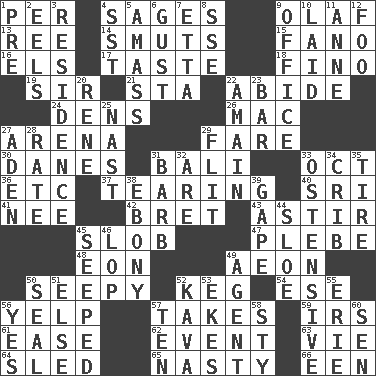 ACROSS 1. For each 4. Gurus 9. Norwegian king 13. To separate or throw off 14. Particles of soot 15. Papal veil 16. Raised railways 17. Clothes sense 18. A pale, very dry sherry 19. Title for a knight 21. R.R. building 22. Tolerate 24. Habitations of wild animals 26. Apple computer (short form) 27. Sports stadium 29. Conductor's collection 30. Natives or inhabitants of Denmark 31. Indonesian resort city 33. Sep. follower 36. And so on (abbr.) 37. Lacerating 40. Indian title of respect (Mr.) 41. Born 42. Cy Young winner Saberhagen 43. Having gotten out of bed 45. Oscar Madison type 47. Military trainee 48. A really long time 49. A really long time 50. Not well drained, as in land 52. Barrel 54. Compass dir. 56. Sharp bark 57. Receives possession of 59. Big collection agency 61. Comfort 62. Happening 63. Compete 64. Downhill vehicle 65. Characterized by obscenity 66. Car or cant ending DOWN 1. Before (prefix) 2. Snakelike fish 3. Home 4. Fast jet (abbr.) 5. Collect or gather 6. Abrupt rush of wind 7. Singer James 8. Compass dir. 9. Place of business 10. Put down 11. Queen of England 1702-14 12. Egg _ yung 20. French philosopher Descartes 22. With great haste 23. Soap unit 25. Political cartoonist Thomas 27. An important port of Yemen 28. Pace 29. Sudden quick movement 31. Sharp remark 32. "We ___ not amused" (Victoria) 33. Clearly or manifestly demonstrative 34. Baby bed with high sides 35. Hoop that covers a wheel 38. Dark wood 39. Open wide 44. A type of plum 45. Oozed 46. Trim (branches) 49. Representative 50. Lick closed 51. Otherwise 52. Polynesian shrub of the pepper family 53. Supplements with great effort 55. 4th largest of the Great Lakes 56. It is so 57. "___ Little Indians" 58. Filthy place 60. Elected rep.