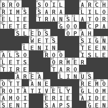 ACROSS 1. Sis' sibling 4. Earth 8. Bowlike part 12. Basketball hoops 14. "Two Mules for Sister ____" 15. _ and Stitch 16. Writer Wiesel 17. Interpreter 20. Wig 21. Thick or sticky substance 22. Accounting whiz (abbr.) 23. Bobsleighs 27. Brightly colored fish 29. Moistens 31. Signal 34. Soviet premier 1918-24 35. Adolescent 36. In addition 39. Friend of Pooh 41. Capri or Wight 42. Allows 43. Abalone 46. Hoop that covers a wheel 47. Edible starchy tuberous root 48. Length times width 51. "_ and Lucy" (Charlie Brown theme song) 54. Baseball player Mel 56. A saturated hydrocarbon 58. San ____ (Riviera town) 61. Producing rotation 66. Take by theft 67. Mine, in Marseilles 68. 4th largest of the Great Lakes 69. Helper 70. Posted 71. Plant excrements 72. Commissioned military rank (abbr.) DOWN 1. Cy Young winner Saberhagen 2. Cause heat under the collar 3. Leaves out 4. Fast jet (abbr.) 5. Rowing implement 6. Lyricist Gershwin 7. Long (Scottish) 8. Wing 9. Actors Guy, Robert Welles, and Clint 10. Hoof sound 11. Israeli folk dance 13. Sew up the eyelids of hawks and falcons 18. "Barney Miller" actor Jack 19. Chop off 24. She-sheep 25. Lair 26. Agitate 28. Moving about 30. Snout, nose 32. Set 33. Compass dir. 34. Failure 36. The first octave above the treble staff 37. Luau accessory 38. Ski resort town in Vermont 40. Of the mouth 44. Medical imaging device (abbr.) 45. Period of immesurable duration 49. Erode 50. Cuckoo 52. Capital and largest city of Mongolia 53. Former Milwaukee Brewers owner Bud 54. Mouths or openings 55. Heavy book 57. Nights before holidays 59. Method 60. Presage 62. Small island 63. Epoch 64. Mouth edge 65. Consenting reply