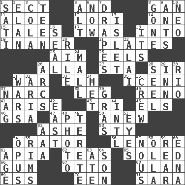 ACROSS 1. Religious group 5. Plus 8. Separate the seeds from cotton 11. Medicinal plant 12. Australian parrot (variant) 14. Single 15. Falsehoods 17. It was, poetically 18. To the inside or interior of 19. More empty; more void 21. Food holders 23. Direct toward a target or goal 25. Snakelike fish 26. Silent film actress Nazimova 27. R.R. building 28. Title for a knight 31. Armed conflict 33. Shade tree 35. Ancient Celtic tribe of eastern Britain 37. Drug cop 38. Part of a journey 40. Western Nevada city 41. Get up 43. Three (prefix) 45. Raised railways 46. Girls' org. (abbr.) 47. Fitting 50. Afresh 52. American tennis player Robert 53. Filthy place 54. Speaker 56. Poe poem 61. Capital of Western Samoa 62. Beverages made from leaves 65. Having a sole or soles 66. Chewing product 67. Von Bismarck 68. Uhlan (variant) 69. Curvy letter 70. Car or cant ending 71. "Two Mules for Sister ____" DOWN 1. Suttee (variant) 2. Style 3. Root beer relative 4. Adolescent 5. Keyboard modifier key 6. Immediately 7. Window treatments 8. Went 9. Pismires 10. Modern: prefix 13. Small island 16. Lick closed 18. It is 20. Cause heat under the collar 22. Mountain range southwest of Kyrgyzstan 24. Shopping center 26. Arches 28. Stitch closed the eyes of (a falcon) 29. Restaurants 30. River (Sp.) 31. Armed conflicts 32. Roberta Peters solo 34. Was introduced to 36. Group working together 37. Tired old horse 39. Pate de foie ____ 42. Compass direction 44. International (abbr.) 48. Picture 49. Cigar-shaped 51. Sight organs 52. Auto club (abbr.) 54. Musical composition 55. Basketball hoops 57. Good sense 58. Rounded earthenware pot or jar 59. Tail end 60. Pulitzer Prize-winning author Ferber 61. Personal question 63. Had dinner 64. Male offspring