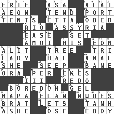 ACROSS 1. One of the Great Lakes 5. White ___ sheet 8. Jai ____ 12. Period of immesurable duration 13. Watch over 15. Left side of a ship or aircraft 16. Portable shelters 18. Singer James 19. Wrote a lyric poem 20. River (Sp.) 22. Nineveh was its capital 24. Comfort 26. Arrange properly for use 27. Mine, in Marseilles 28. Part of HMS, perhaps 29. A really long time 32. Came down and settled, as after flight 35. Family _ (genealogy) 37. Three (prefix) 38. Kenny Rogers chart-topper in '80 39. Actor Linden 40. Of or related to the anus 41. A female animal or person 42. Ooze 43. Object of repulsion 44. Mouth or opening 45. For each 46. Supplements with great effort 49. One more than two 50. Do over again 51. Mood resulting from idleness 55. Set 56. California wine valley 57. Flair 59. Unadorned figures 63. Naughty child 64. Allows 65. Hyperbolic tangent 66. American tennis player Robert 67. Order of Saint Francis (abbr.) 68. Whirlpool DOWN 1. Consume 2. To sift 3. Electrically charged atom 4. Plea 5. Had dinner 6. Bristle 7. Pismires 8. To the left, to Queeg 9. Farming town in central California 10. Length times width 11. It would 14. Small ungulate mammals of Africa 17. Thailand, formerly 21. Bear (Spanish) 23. Consenting reply 25. One or the other of two 28. Assistant 29. Inactive volcano in Sicily 30. Northwest Algerian city 31. Mediterranean tributary 32. In addition 33. Cowardly lion portrayer 34. The main thing one is thinking about 36. Actress Charlotte 40. Utter; complete 42. A glass for beer 45. Sliced dessert 47. Barrel 48. Genesis locale 49. Feeling or showing extreme anger 51. Taverns 52. Brightly colored fish 53. Margarine 54. Floor protectors 56. Basketball assoc. 58. Overdraft (abbr.) 60. June honoree 61. Conclude 62. Like a shrinking violet