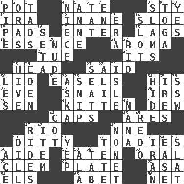 ACROSS 1. Cooking vessel 4. Nathan's nickname 8. Filthy place 11. Retirement account (abbr.) 12. Lacking in sense or substance 14. A type of plum 15. Groovy apts. 17. Keyboard key 18. Straggles 19. Substance 21. Odor 23. Third day of the wk. 24. It is 25. Froth on beer 27. Stated 30. Flaplike covering 31. Artist's stands 34. Part of HMS, perhaps 37. First lady 38. Slow-paced one 39. Big collection agency 40. Elected rep. 41. Baby cat 43. Morning condensation 44. Smile enhancers 45. Ancient Greek god of war 47. _ de Janeiro 49. Compass dir. 50. Simple song 52. Sycophants 56. Assistant 57. Ingested 60. Relating to the mouth 61. Clement's nick name 62. Food holder 63. White ___ sheet 64. Raised railways 65. Collude with 66. Remaining after all deductions DOWN 1. Corncob 2. Mouths or openings 3. Small boys 4. Sibling's daughter 5. Singer Murray 6. Make lace 7. Compass dir. 8. Hits or strikes with great force 9. Ancient Roman robe 10. Consenting reply 13. Period 14. Groove 16. Stalk of a moss capsule 20. Unadorned 22. To free from 25. Hub of activity 26. Paradise 27. Theater features 28. Came down and settled, as after flight 29. Capri or Wight 30. French article 32. "____ silly question..." 33. Sever or remove by pinching or nipping 34. Flintstone garb 35. Angers 36. Compass dir. 42. Nanny 44. Small bed 46. Redecorate 47. Amusement-park features 48. A whole individual unit 49. Music written for nine 50. Deli pickle 51. Slangy assent 52. Wig 53. SW Asia republic 54. Relaxation 55. Narrow board 56. Adept person 58. Chicken ___ king 59. Keyboard key