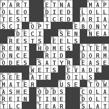 ACROSS 1. Piece 5. Inactive volcano in Sicily 9. Atlas unit 12. Margarine 13. Passed on 14. Hang loosely or laxly 15. Trial 16. On the rocks 17. Roberta Peters solo 18. _-fi 19. Elect 21. Dark wood 22. Tenth: prefix 24. Elected rep. 26. Teachers' org. 27. Musical pauses 28. Snakelike fish 29. Monthly bill 30. Residences 32. A distinct part 36. Single time 37. To free from 38. Dormintory (informal) 39. Lyric poems 40. Letch 42. Relaxation 43. Soaks 44. Elude 46. Perceive with the eye 49. Had dinner 50. Petroleums 51. Mother 53. Purpose 54. Pull behind 57. American tennis player Robert 58. Likelihood 61. Root beer relative 62. It's straight from the horse's mouth 63. Prong on a fork 64. Dunce 65. Affectionate concern, for short 66. Lacerate 67. Narrow board DOWN 1. Plant holders 2. Actor Baldwin 3. Home 4. Small child 5. Prepare for publication 6. Nervous spasm 7. Born 8. Increase 9. Person of subnormal intelligence 10. Place in a line 11. Beach, in Buenos Aires 14. Experiment locale 19. Sep. follower 20. Expression of disdain 21. Followers of ems 23. _____ Park, CO 24. Morally degraded 25. Raised railways 27. Tear apart 28. Sends forth 29. Friend of Pooh 31. Declaim 32. Perfect 33. Inedible or poisonous agaric 34. Celtic language 35. Madame (abbr.) 40. Put into a specified state 41. Vintage cars 43. Armed conflict 45. Compete 46. Don Adams' spy role 47. Artist's stand 48. Principle of right and wrong 52. Car or cant ending 53. One who uses or employs something 55. Water jar 56. Electrical Unit 58. Baseball player Mel 59. Pass on 60. Heredity factor (abbr.) 61. Music discs