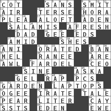 ACROSS 1. Small bed 4. Without 8. Stricken, poetically 12. Wind 13. Laconic 14. Israeli folk dance 15. Entreaty 17. At or to great height 18. Arabian gulf 19. Deli grouping 21. Anew 23. June honoree 24. Unit of force equal to gravity 26. Begley and Asner 27. Among 28. "______ My Girl" (Turtles hit) 30. Black tropical American cuckoo 31. Spoke pompously 34. Bar 37. Cartoonist voice _ Blanc 38. Indian princess (variant) 39. "We ___ not amused" (Victoria) 40. Leather borer 41. Burden 42. Corporate head (abbr.) 43. Trig term 44. "____ silly question..." 46. Set 47. Reproach for some lapse or misdeed 50. Personal Computers (abbr.) 51. Place where plants grow 54. Portable computers 57. Double curve, resembling the letter S 58. Feeling or showing extreme anger 60. Falsehood 62. Lightbulb-shaped fruit 63. 61 cubic inches 64. Island 65. Fast planes 66. Genesis locale 67. She-sheep DOWN 1. Head covering 2. Lubricates 3. Excercise machine 4. Major League Baseball Commissioner Bud 5. Came up 6. Overdraft (abbr.) 7. Bristle 8. Pottery fragments 9. Methods 10. Angers 11. Hyperbolic tangent 13. Scottish cap 16. Mountain range southwest of Kyrgyzstan 20. Find the sum of 22. Nourish 25. First name in cosmetics 27. Afresh 29. Person who is morally reprehensible 30. Nursemaid (var.) 31. NW Algerian seaport 32. Less widely known 33. Plus 34. Keyboard key 35. Length times width 36. Modern: prefix 41. Do some clerical work 43. Spring feasts 44. Fitting 45. Native of Scotland 46. Relatively large 48. Having winglike extensions 49. Eucharist need 51. Republicans 52. Ripens 53. Mediterranean tributary 55. For each 56. Cole _ (cabbage dish) 59. To free from 61. Sight organ