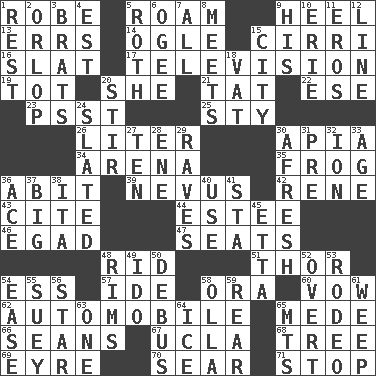ACROSS 1. Loose flowing garment 5. Wander 9. Person who is morally reprehensible 13. Blunders 14. Stare at amorously 15. High-altitude cloud 16. Narrow board 17. Boob tube 19. Small child 20. A female animal or person 21. Make lace 22. Compass dir. 23. Inconspicuous attention getter 25. Filthy place 26. 61 cubic inches 30. Capital of Western Samoa 34. Sports stadium 35. Tree-dwelling hopper 36. "This won't hurt ____!" 39. Mole, birthmark 42. French philosopher Descartes 43. Quote 44. First name in cosmetics 46. Mild oath 47. Theater features 48. To free from 51. Son of Odin 54. Double-curved letter 57. Binary compound 58. Mouth or opening 60. Solemn pledge 62. Car 65. Ancient Persian 66. Seines 67. Southern CA. univ. 68. Relationship diagram 69. Jane of fiction 70. Wither 71. Constrict DOWN 1. State of inaction 2. Fourth or lowest deck 3. Naughty children 4. Eastern Standard Time (abbr.) 5. Writer of Portnoy's Complaint (1969) 6. Double curve, resembling the letter S 7. 100% 8. Confronts 9. Part of HMS, perhaps 10. 4th largest of the Great Lakes 11. Greek god of love 12. Actor's bit 15. Municipality 18. Large container 20. Disorderly outburst 24. Scheduled 27. Nine, plus one 28. Compass dir. 29. All-night dance parties 30. Anew 31. Before (prefix) 32. Electrically charged atom 33. Mature 36. Adept person 37. Of large size 38. Call ___ day 40. Purpose 41. R.R. building 45. Singer James 48. Basketball hoops 49. Wedding promise 50. To get out of a bus 52. Unconcealed 53. Cowboy competition 54. Comfort 55. Chop _ 56. Play the lead 58. Rounded earthenware pot or jar 59. Bring up, as a child 61. Shed a tear 63. Single 64. Frozen water 65. Mountains (abbr.)