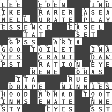 ACROSS 1. Area sheltered from the wind 4. Locale of original sin 8. Working for oneself (abbr.) 11. Mamie's husband 12. Less widely known 14. Toward the sea 15. 1994 drama film starring Jodie Foster 17. A salt of uric acid 18. Live dramatic performance 19. Gist 21. Artist's stand 23. Make lace 24. Put into a specified state 25. Global Positioning Systems (abbr.) 27. Roberta Peters solo 30. Thick or sticky substance 31. Bathroom 34. _ tizzy (2 wds.) 37. Affirmative reply 38. Let have 39. Simpleton 40. Pacific Standard Time (abbr.) 41. Food allowance for one day 43. Sight organ 44. French philosopher Descartes 45. Mouths or openings 47. Call ___ day 49. Regret 50. Window treatment 52. Simpletons 56. Parka part 57. Roamer 60. A blast of a horn 61. Taverns 62. Maternal 63. Compass dir. 64. Filthy place 65. Sight organs 66. Fast jet (abbr.) DOWN 1. Actor's bit 2. Supplements with great effort 3. Snakelike fish 4. Spew [out] 5. Have the gumption 6. Epoch 7. Remaining after all deductions 8. Small island 9. Actress Patricia 10. 24 hours 13. Portuguese money of account (variant) 14. Domed church section 16. Allows 20. Political cartoonist Thomas 22. White ___ sheet 25. Travels 26. Mail 27. Having winglike extensions 28. Painter Guido (1575-1642) 29. "Tell ____ the Marines!" 30. Flimflam 32. Legendary monster 33. SW Asia republic 34. The content of cognition 35. Negative votes 36. Deep reverence 42. Part of speech 44. Hit sharply and swiftly 46. Monthly bill 47. Literary sarcasm 48. Bits 49. Amusement-park features 50. Do not 51. Compass dir. 52. Nathan's nickname 53. Charged particles 54. Immeasurably long periods of time 55. Proofreading order 56. Part of HMS, perhaps 58. Single 59. Can I?