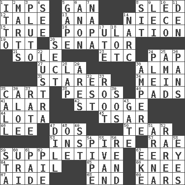 ACROSS 1. Naughty children 5. Separate the seeds from cotton 8. Downhill vehicle 12. Story 13. Santa ___, CA 14. Sibling's daughter 15. Loyal 16. Census information 19. Baseball player Mel 20. Elected representative 21. Not divided or shared with others 23. And so on (abbr.) 24. Infant food 27. Southern CA. univ. 30. _ mater 31. A viewer who gazes fixedly 34. Count _ (2 wds.) 35. Draw slowly or heavily 38. Mexican monetary units 40. Writing tablets 41. Having or resembling wings 42. Moe Howard, for one 44. Globular water bottle used in Asia 45. Russian ruler of old 46. Area sheltered from the wind 47. Two (Sp.) 50. Pull apart 53. Stimulate to action 57. Actress Charlotte 59. Supplying deficiencies 63. Suggestive of the supernatural 64. Drop behind 65. Baking dish 66. Leg joint 67. Helper 68. Conclusion 69. Hearing organs DOWN 1. "Tell ____ the Marines!" 2. Shops 3. Greek god of the underworld 4. Perceive with the eye 5. Open wide 6. Soon (poet.) 7. California wine valley 8. Be seated 9. Luau accessory 10. Environmental prefix 11. Lair 14. Drug cop 17. Shoshoni 18. Car dealer's back yard 20. Religious group 22. A period of five years 24. Entreaty 25. Among 26. Baking dishes 28. Pet locale 29. Ancient Greek god of war 30. Electrical Unit 32. Eastern Standard Time (abbr.) 33. Carrot, for example 35. Give a ring to 36. Medicinal plant 37. Pace 39. Mayday 43. Yard entry 47. Deli pickle 48. Single 49. Fast jet (abbr.) 51. Sports stadium 52. More valued for its uncommonness 54. Corncob 55. _ the terrible 56. Tear apart 58. Sight organs 59. R.R. building 60. RI univ. 61. Groovy apt. 62. Sliced dessert 63. Supplement with great effort