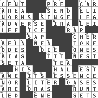 ACROSS 1. Penny 5. Before (prefix) 8. Automobile 11. Type of rug 12. Post 14. Connecticut Ivy Leaguer 15. Typical standards 17. Scorch 18. Part of a journey 19. Contrary to your interests or welfare 21. Lyricist Gershwin 22. Flowery wreath 23. Area sheltered from the wind 24. Frozen water 25. Hit sharply and swiftly 27. Plant excrement 28. "Mermaids" star 31. Actor Lugosi 35. Teachers' org. 37. Casino tip 38. Lyric poems 39. Expire 41. Washington bills 42. Prejudice 43. Teat (slang) 45. A home for chicks 46. Stalk of a moss capsule 47. Afternoon social gathering 49. Part of HMS, perhaps 51. Actor Linden 52. Eastern Standard Time (abbr.) 55. Deep reverence 57. It is 60. Core 62. And not 63. 61 cubic inches 65. Fertile tracts in a desert 66. "We ___ not amused" (Victoria) 67. Mouths or openings 68. Undersized animal 69. Directed 70. Compass dir. 71. Puts into a specified state DOWN 1. Lessep's creation 2. Eat (away) 3. Boldness 4. Docile 5. Air pressure measure (abbr.) 6. Painter Guido (1575-1642) 7. Engineer (abbr.) 8. Portable communications device 9. Toward shelter 10. Swiss mountan, "Queen of the Mountains" 13. Letter starter 16. Indian titles of respect 17. Oozed 20. Glance over 26. Gambison 29. Supplements with great effort 30. Remainder 31. Moves up and down 32. Singer Brickell 33. Resembling or made to resemble leather 34. Slender Brazilian palm 36. Small island 40. One or the other 44. Afternoon social gatherings 48. In addition 50. Grain storage tower 52. Follow as a consequence or result 53. Aroma 54. Trials 55. Of or related to the anus 56. Had on 58. Hoop that covers a wheel 59. Comedian Laurel of Laurel & Hardy 61. Hearing organs 64. Compass dir.