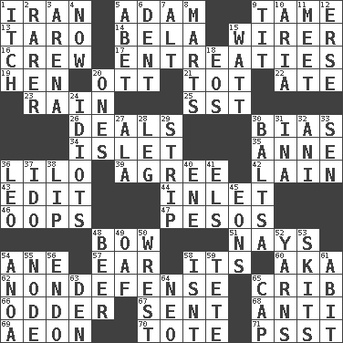 ACROSS 1. SW Asia republic 5. First man 9. Not wild 13. Pacific island yam 14. Actor Lugosi 15. One who wires 16. Ship's personnel 17. Pleas 19. Layer 20. Baseball player Mel 21. Small child 22. Had dinner 23. Water falling in drops from the sky 25. Fast jet (abbr.) 26. Allots cards 30. Prejudice 34. Small island 35. Queen of England 1702-14 36. _ and Stitch 39. Match 42. (Had) reclined 43. Prepare for publication 44. An arm off of a larger body of water 46. I made a mistake 47. Mexican monetary units 48. Arrow shooter 51. Negative votes 54. One (Scot) 57. Hearing organ 58. ___ a Wonderful Life 60. Alias (abbr.) 62. Unrelated to defense, as in spending 65. Baby bed with high sides 66. More peculiar 67. Emitted 68. Opposed to 69. A really long time 70. Carry 71. Inconspicuous attention getter DOWN 1. Hankering 2. More valued for its uncommonness 3. Sports stadium 4. At this time 5. Collude with 6. Gouge 7. Keyboard modifier key 8. Shops 9. Teat (slang) 10. Operatic vocal solo 11. Confront 12. Celtic language 15. Electrical Unit 18. Greek goddess of the dawn 20. Washington bills 24. Foolish or stupid persons 27. In the manner of 28. Part of a journey 29. Empty completely 30. Greek mezzo-soprano Agnes 31. _ tizzy (2 wds.) 32. Black tropical American cuckoo 33. Elected rep. 36. Lion 37. Wedding promise 38. Mouth edge 40. Compass dir. 41. Raised railways 45. Immeasurably long periods of time 48. Fermented drink made from hops 49. Clumsy lout 50. Obtain by seizing forcibly or violently 52. Entertaining tales 53. Burlesque acts 54. Small Philippine buffalo 55. Thickened enlargement 56. Inside; within (prefix) 58. Is not 59. False hair 61. "This won't hurt ____!" 63. Lair 64. Modern: prefix 65. Head covering