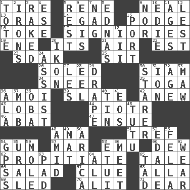 ACROSS 1. Hoop that covers a wheel 5. French philosopher Descartes 9. Actress Patricia 13. Mouths or openings 14. Mild oath 15. Plash 16. Casino tip 17. Seigniories (variant) 19. Compass dir. 20. ___ a Wonderful Life 21. Atmosphere 22. Eastern Standard Time (abbr.) 23. Neighbor of Neb. 25. Be seated 26. Having a sole or soles 30. Thailand, formerly 34. Contemptuous expression 35. Ancient Roman robe 36. Mine, in Marseilles 39. Chalkboard 42. Afresh 43. Tennis shots 44. Peter (Polish) 46. Blind as ____ 47. Follow as a consequence or result 48. Wet nurse (var.) 51. Not kosher 54. Chewing product 57. Third mo. 58. Australian flightless bird 60. Morning condensation 62. Appease 65. Story 66. First course 67. A slight indication 68. Silent film actress Nazimova 69. Downhill vehicle 70. Came down and settled, as after flight 71. Letter starter DOWN 1. Carry 2. Removes the wrinkles 3. Swept the length of 4. Compass dir. 5. Remainder 6. The front part of a cuirass 7. Tired old horse 8. Ferber et al. 9. Not either 10. Singer Brickell 11. Eras 12. For fear that 15. Sweet dark-red dessert wine 18. One more than two 20. Image 24. Aid 27. French article 28. Snakelike fish 29. Window treatment 30. A viewer who gazes fixedly 31. Electrically charged atom 32. Mature 33. Informal term for the mouth 36. Wing 37. Crowd into 38. Chief or king in Benin or Nigeria 40. Shallow baking pan 41. Greek goddess of the dawn 45. Ballerina skirt 48. Among 49. Floor covering 50. N. Chile seaport 52. Peak District village in England 53. Man or boy (slang) 54. Global Positioning Systems (abbr.) 55. Mountain range 56. Undercover agent 58. Needle case 59. Confront 61. Erode 63. Writing tablet 64. Everything 65. Bit