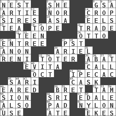 ACROSS 1. A home for chicks 5. A female animal or person 8. Girls' org. (abbr.) 11. Nick name for Arthur 13. And not 14. Riding implement 15. Begets 16. White ___ sheet 17. Snakelike fish 18. Afternoon social gathering 19. Drink excessively 21. Swap 22. Adolescent 24. "Beetle Bailey" pooch 25. Main course 27. Pacific Standard Time (abbr.) 29. At once, immediately (arch.) 30. Satellite of Uranus 32. Painter Guido (1575-1642) 33. Carrier 35. Blind as ____ 39. Webber/Rice musical 41. Give a ring to 42. Sep. follower 43. Medicinal drug used to evoke vomiting 45. Indian skirt 48. Keg 49. Having ears or earlike features 50. Cy Young winner Saberhagen 52. Scottish cap 55. The Jewish people; Israel 56. _ Lanka 57. Peak District village in England 59. In addition 60. Writing tablet 61. Thermoplastic polyamide 62. Purpose 63. Had dinner 64. Makes supply last DOWN 1. Political cartoonist Thomas 2. 4th largest of the Great Lakes 3. Ski resort town in Vermont 4. Neckwear 5. Fastener 6. Stockings 7. Period 8. Relatively large 9. Twentieth part of a lira 10. Domed church section 12. First name in cosmetics 14. Sure thing 20. Single 21. Lug 23. Bert's buddy 25. Hearing organ 26. Compass dir. 27. Before (prefix) 28. Title for a knight 30. "One Day ___ Time" 31. Shoestrings 33. Nervous spasm 34. Baseball player Mel 36. Sass 37. In the manner of 38. Affectionate concern, for short 40. State of nonexistence 43. Frozen water 44. Eucharist need 45. Travels by water 46. Came up 47. Western Nevada city 49. He sold his birthright 50. Naughty child 51. Travel on or in a vehicle 53. _ vera 54. Not women's 56. Health resort 58. Color