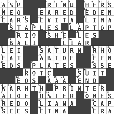 ACROSS 1. Cleo's killer 4. Tall New Zealand timber tree 8. Possessive pronoun 12. Modern: prefix 13. Having ears or earlike features 14. Genesis locale 15. Hearing organs 17. Webber/Rice musical 18. Pale green bean 19. Paper fasteners 21. Portable computer 23. _ de Janeiro 24. A female animal or person 26. French article 27. Indonesian resort city 28. One who doesn't tell the truth 30. Flowery wreath 31. Titan orbits this 34. 17th letter of the Greek alphabet 37. Erode 38. Stay 39. Car or cant ending 40. Begley and Asner 41. Food holders 42. Compass dir. 43. College mil. group 44. Set of matching outer garments 46. Greek goddess of the dawn 47. American Automobile Association (abbr.) 50. Conclusion 51. Heat 54. Hard copy producer 57. _ vera 58. Flexible twig of a willow tree 60. Singles 62. Do over again 63. Climbing, woody, usually tropical vines 64. Head covering 65. Observes 66. Inactive volcano in Sicily 67. Period DOWN 1. A saturated hydrocarbon 2. Oceans 3. Likenesses of persons 4. All-night dance parties 5. From or relating to Ireland 6. Was introduced to 7. Hereditary estate 8. Aide 9. Proofreads 10. San ____ (Riviera town) 11. Fastener 13. Snakelike fish 16. Move on water 20. Luau course 22. ____ Jay Lerner 25. Dodge 27. Necklace unit 29. Angers 30. Area sheltered from the wind 31. Table seasoning 32. Phillipine bananalike plant 33. Teat (slang) 34. Home 35. Command 36. Single 41. Mail 43. Lover boys 44. Elected rep. 45. To (old English) 46. Eat (away) 48. Bee-related 49. Sports stadium 51. Armed conflicts 52. Toward shelter 53. Opening into or through something 55. Lyricist Gershwin 56. Bring up, as a child 59. Be seated 61. Health resort