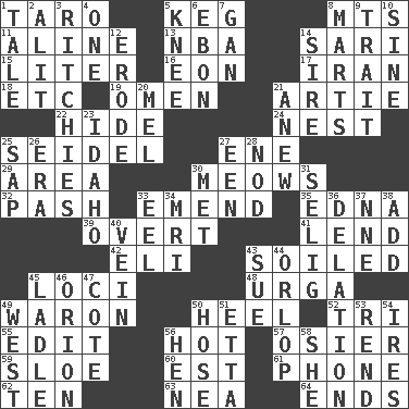 ACROSS 1. Pacific island yam 5. Cask 8. Mountains (abbr.) 11. Place in a line 13. Basketball assoc. 14. Indian skirt 15. 61 cubic inches 16. Period of immesurable duration 17. SW Asia republic 18. And so on (abbr.) 19. Presage 21. Nick name for Arthur 22. Flintstone garb 24. Egg locale 25. A glass for beer 27. Compass dir. 29. Type of rug 30. Catcalls? 32. Romantic infatuation 33. Make improvements or corrections to 35. Pulitzer Prize-winning author Ferber 39. Unconcealed 41. Grant temporary use of 42. Biblical high priest 43. Dirtied 45. Locales 48. Capital and largest city of Mongolia 49. Make _____ (do battle with) 50. Person who is morally reprehensible 52. Three (prefix) 55. Prepare for publication 56. Being at a high temperature 57. Flexible twig of a willow tree 59. A type of plum 60. Eastern Standard Time (abbr.) 61. Give a jingle 62. "___ Little Indians" 63. Teachers' org. 64. Extremities DOWN 1. Lie 2. Came down and settled, as after flight 3. Actors Guy, Robert Welles, and Clint 4. Single 5. Leg joint 6. Inky black, to poets 7. Separate the seeds from cotton 8. Shops 9. Distinguishing feature 10. Trig term 12. Eat (away) 14. Title for a man of rank and authority 20. Cartoonist voice _ Blanc 21. Afresh 23. Potato state 25. Plant excrement 26. Period 27. Car or cant ending 28. Lower and raise head in agreement 30. Was introduced to 31. Former Milwaukee Brewers owner Bud 33. Snakelike fish 34. Medical imaging device (abbr.) 36. Accusation by an informer 37. Compass dir. 38. Say or write further 40. Distinctive style or manner 43. Institute legal proceedings 44. Fourth or lowest deck 45. Dipping utensil 46. Greek mythologigal hunter 47. ____ d'Azur (French Riviera) 49. Compass direction 50. Flexible conduit 51. Singer James 53. Tear apart 54. Angers 56. Layer 58. A female animal or person