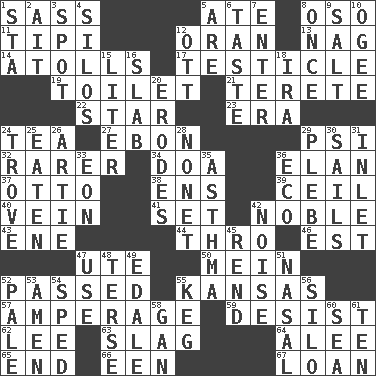 ACROSS 1. Backtalk 5. Had dinner 8. Bear (Spanish) 11. Native american tent (variation) 12. NW Algerian seaport 13. Tired old horse 14. Ringlike coral islands and reefs 17. One of the two male reproductive glands 19. Rest room 21. Cigar-shaped 22. Play the lead 23. Epoch 24. Beverage made from leaves 27. Inky black, to poets 29. 23rd letter of the Greek alphabet 32. More uncommon 34. ___ good deed 36. Style 37. "Beetle Bailey" pooch 38. Followers of ems 39. To provide with a ceiling 40. Distinctive style or manner 41. Put into a specified state 42. Having high moral qualities 43. Compass dir. 44. Through, poetically 46. Eastern Standard Time (abbr.) 47. Shoshoni 50. Chow _ 52. Went by 55. Sunflower state 57. Electrical Measurement 59. Cease 62. Area sheltered from the wind 63. Volcanic refuse 64. Toward shelter 65. Conclude 66. Car or cant ending 67. Grant temporary use of DOWN 1. R.R. building 2. Small island 3. Specific locale 4. Grain storage towers 5. "We ___ not amused" (Victoria) 6. Clothes sense 7. Keyboard key 8. Single time 9. Table seasoning 10. Double curve, resembling the letter S 12. Baseball player Mel 15. 61 cubic inches 16. Thick slice 18. Retirement account (abbr.) 20. Eats (away) 24. Collection of objects 25. Eroded 26. Nick name for Arthur 28. Music written for nine 29. First-year military academy student 30. Moves on water 31. An arm off of a larger body of water 33. A really long time 35. Respiratory problem 36. Environmental prefix 42. Annoying sound 45. Tear apart 47. Purpose 48. Laconic 49. Peak District village in England 51. Relating to the nose 52. Diluted with white 53. So be it 54. Broke a traffic law 55. Barrel 56. Grain storage tower 58. Separate the seeds from cotton 60. Ocean 61. Nine, plus one