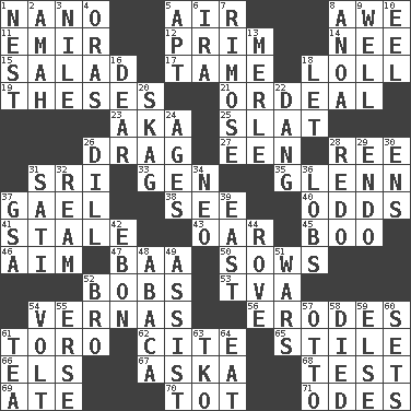 ACROSS 1. Billionth: prefix 5. Atmosphere 8. Deep reverence 11. Arab leader 12. Demure 14. Born 15. First course 17. Not wild 18. Hang loosely or laxly 19. College papers 21. Severe or trying experience 23. Alias (abbr.) 25. Narrow board 26. To trail on the ground 27. Car or cant ending 28. To riddle 31. Indian title of respect (Mr.) 33. Commissioned military rank (abbr.) 35. American astronaut and politician John 37. Highlander 38. Perceive with the eye 40. Probability 41. Showing deterioration from age 43. Rowing implement 45. Oct. 31 cry 46. Direct toward a target or goal 47. Sound made by sheep 50. Sty mamas 52. Moves up and down 53. Federal power corp. 54. Actresses Bloom and Felton 56. Eats (away) 61. "Corrida" creature 62. Quote 65. Vertical member of a panel or frame 66. Raised railways 67. "____ silly question..." 68. Trial 69. Had dinner 70. Small child 71. Lyric poems DOWN 1. Egg locale 2. Nursemaid 3. The longest river in the world 4. Mouths or openings 5. Fitting 6. Retirement account (abbr.) 7. Full of chinks, cracks, or crevices 8. Small Philippine buffalo 9. Not ill 10. Snakelike fish 13. Haggard of country music 16. Letter starter 18. Allow 20. Heroin 22. Mild oath, euphamism for damn 24. Matures 26. Deli pickle 28. Redecorate 29. Inside; within (prefix) 30. Followers of ems 31. Suttee (variant) 32. 480, 500 or 516 sheets of paper 34. Modern: prefix 36. Tennis shots 37. Girls' org. (abbr.) 39. Compass direction 42. Inky black, to poets 44. Be footloose 48. Phillipine bananalike plant 49. Help 51. Armed conflicts 52. Sis' sibling 54. Electrical Unit 55. Celtic language 57. Von Bismarck 58. Passed on 59. Otherwise 60. Puts into a specified state 61. Afternoon social gathering 63. Ring climax 64. Erode