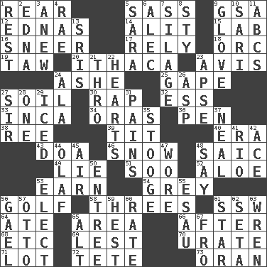 ACROSS 1. Located in or toward the back 5. Backtalk 9. Girls' org. (abbr.) 12. Ferber et al. 14. Set down 15. Experiment locale 16. Scornful expression 17. Have trust in 18. The grampus (Milton) 19. The 23rd letter of the Hebrew alphabet 20. New York city 23. Deliberation 24. American tennis player Robert 25. Open wide 27. The visible part of the earth's surface 30. Strike 32. Double-curved letter 33. South American Indian 34. Mouths or openings 36. Fenced enclosure 38. Portuguese money of account (variant) 39. Teat (slang) 40. Epoch 43. ___ good deed 46. Overwhelm 48. Ketch in the Levant 49. Whopper 51. "Barney Miller" actor Jack 52. Medicinal plant 53. Merit 54. Jennifer or Joel 56. Eighteen holes 58. Triplets 61. Compass dir. 64. Had dinner 65. Type of rug 66. Following 68. And so on (abbr.) 69. For fear that 70. A salt of uric acid 71. Car dealer's back yard 72. False hair 73. NW Algerian seaport DOWN 1. Repose 2. Pulitzer Prize-winning author Ferber 3. Afresh 4. Actress Charlotte 5. "Two Mules for Sister ____" 6. Actor Baldwin 7. Fodder prepared in a silo 8. Filthy place 9. Michael Jackson trademark 10. Indian skirt 11. Lettered men learn these first 13. Indian titles of respect 21. Through, poetically 22. Centers of feelings and intuitions 23. Domed church section 24. Wing 26. Cleo's killer 27. Title for a knight 28. Single 29. On the rocks 31. Aches 35. Moe Howard, for one 37. Actress Patricia 41. _ de Janeiro 42. Adept person 44. Norwegian king 45. Wind 47. Had on 48. Declare 50. Main course 53. Voters do this 55. Son of Isaac 56. Highlander 57. Von Bismarck 59. Command 60. Assign a rank or rating to 61. Play the lead 62. Stalk of a moss capsule 63. Songbird 65. The first octave above the treble staff 67. Away