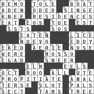 ACROSS 1. San ____ (Riviera town) 5. Lacquered or enameled metalware 9. Water vessel 13. An important port of Yemen 14. Wrote a lyric poem 15. Burn superficially 16. Leg joint 17. Homes 19. Erode 20. Greek goddess of the dawn 21. Third day of the wk. 22. Eastern Standard Time (abbr.) 23. Fast planes 25. Mayday 26. Eroded 30. Louse (plural) 34. New (sp.) 35. Whirlpool 36. Supplemented with great effort 39. Nest on high 42. Sense of smell 43. Past tense of be (plural) 44. With motion or animation 46. Mild oath 47. Scornful expression 48. Shade tree 51. Snakelike fish 54. Sep. follower 57. Friend of Pooh 58. Everything 60. Shoshoni 62. Appease 65. Of or related to the anus 66. Laconic 67. Narrow, elongated depression 68. Friends 69. Religious group 70. Scottish caps 71. Woody plant DOWN 1. Libertine 2. Ferber et al. 3. Confronts 4. Single 5. "Corrida" creature 6. Lyric poems 7. French article 8. Proofreads 9. Storage container 10. Single time 11. Grows older 12. Trial 15. Observes 18. Superhero pair 20. He sold his birthright 24. Watched over 27. Beverage made from leaves 28. First lady 29. Typical models 30. Poe poem 31. Wedding promise 32. Music discs 33. Sight organ 36. She-sheep 37. Barrel 38. Epoch 40. Electrically charged atom 41. Compass dir. 45. Sew up the eyelids of hawks and falcons 48. One of the Great Lakes 49. Car dealer's back yard 50. Wet 52. Type of eclipse 53. Showing deterioration from age 54. Chooses 55. Algonquian 56. Torque (variant) 58. Smallest unit of an element 59. Allows 61. Otherwise 63. Pacific Standard Time (abbr.) 64. Insect wing 65. Fitting