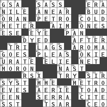 ACROSS 1. Girls' org. (abbr.) 4. Backtalk 8. Period 11. Mediterranean tributary 13. Approach 15. Partially opened flower 16. NW Algerian seaport 17. Stone: prefix 18. Having a low temperature 19. Distance measurement 21. Direct toward a target or goal 22. Washington bills 23. Compass dir. 24. Sight organ 27. Baking dish 29. Colored 30. Following 34. Three (prefix) 36. Falls behind 39. Scent 40. Travels 41. Entreaties 43. Migrant worker of the '30s 44. A salt of uric acid 46. Writer Wiesel 47. Remaining after all deductions 48. Person of subnormal intelligence 49. Political cartoonist Thomas 51. Acura sports coupe 53. Attempt 54. Title for a knight 57. System (abbr.) 60. Madame (abbr.) 63. Paris' subway 65. Nights before holidays 66. Nest on high 69. Frog relative 70. Car or cant ending 71. Father Junipero _ 72. Quote 73. Fast jet (abbr.) 74. Russian ruler of old 75. Corporate head (abbr.) DOWN 1. Dwarf 2. Founders of families 3. Having winglike extensions 4. Plant excrement 5. One (Scot) 6. Bristle 7. Indian skirt 8. Inky black, to poets 9. Governing power 10. Does sums 12. Compass dir. 14. Play 18. Meet 20. Marina Del _, California 25. Sharp bark 26. Peak District village in England 28. Auto club (abbr.) 29. What propaganda does 31. Casino tip 32. Send forth 33. Actress Charlotte 34. "Corrida" creature 35. Hitchcock's "____ Window" 37. Set 38. Inhabitant of Heaven 40. Chewing product 42. Burn superficially 45. Followers of ems 50. Symbol (abbr.) 52. Dec. holiday 54. Unemotional 55. Feeling or showing extreme anger 56. Cowboy competition 57. Perceives with the eye 58. Jacques Cousteau's middle name 59. Emitted 61. Rendezvous 62. Blunders 64. And so on (abbr.) 67. Lyricist Gershwin 68. Ewer handle