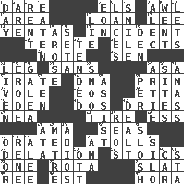 ACROSS 1. Have the gumption 5. Raised railways 8. Leather borer 11. Length times width 12. Rich soil 13. Area sheltered from the wind 14. Gossips 17. Event 19. Cylindrical with tapered ends 21. Opts 22. Brief written record 23. Elected rep. 24. Part of a journey 27. Without 29. White ___ sheet 32. Feeling or showing extreme anger 34. Heredity factor (abbr.) 36. Demure 37. Grand slam 38. Greek goddess of the dawn 39. Singer James 40. Locale of original sin 41. Two (Sp.) 42. Frees from moisture 43. Teachers' org. 44. Become fatigued 46. Curvy letter 47. Housemaid (var.) 50. Oceans 52. Declaimed 55. Ringlike coral islands and reefs 57. Conveyance 59. Unemotional ones 62. Single 63. Round or rotation of duties 64. Narrow board 65. To sift 66. Eastern Standard Time (abbr.) 67. Israeli folk dance DOWN 1. 24 hours 2. "We ___ not amused" (Victoria) 3. Monthly bill 4. Eroded 5. A really long time 6. Shoestrings 7. Grin 8. Actor Baldwin 9. Gone 10. Allows 12. Falsehood 15. Came up 16. Bristle 18. Lair 20. Looked after 24. Make or become more lively 25. Eat (away) 26. An organ shaped like a helmet 28. Snob 29. Nick name for Arthur 30. Locates 31. Collect or gather 33. "___ Little Indians" 35. Help 36. For each 42. Started a card game 45. Vintage cars 47. _ moment's notice (2 wds.) 48. Distance measurement (Brit.) 49. Goodbye (Sp.) 51. Splash clumsily 52. Aroma 53. French philosopher Descartes 54. Toward shelter 55. Santa ___, CA 56. Grain storage tower 58. Baseball player Mel 60. 4-wheeled motor vehicle 61. R.R. building