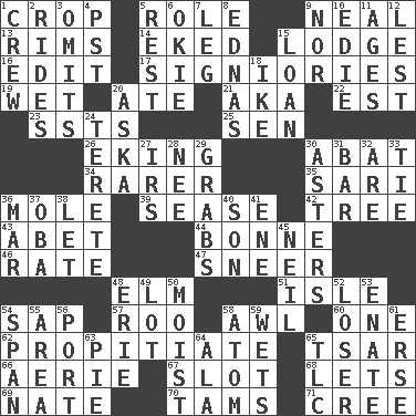 ACROSS 1. Riding implement 5. Hero or heavy, e.g. 9. Be tempered by heat 13. Basketball hoops 14. Supplemented with great effort 15. Cabin 16. Prepare for publication 17. Seigniories (variant) 19. Dripping 20. Had dinner 21. Alias (abbr.) 22. Eastern Standard Time (abbr.) 23. Fast planes 25. Elected rep. 26. Supplementing with great effort 30. Blind as ____ 34. Less widely known 35. Indian skirt 36. Undercover agent 39. Gospel singer Marvin 42. Woody plant 43. Collude with 44. Child's nurse 46. Assign a rank or rating to 47. Contemptuous expression 48. Shade tree 51. Capri or Wight 54. Plant excrement 57. Friend of Pooh 58. Leather borer 60. Single 62. Conciliate 65. Russian ruler of old 66. Nest on high 67. Groove 68. Allows 69. Nathan's nickname 70. Scottish caps 71. Algonquian DOWN 1. Group working together 2. Amusement-park features 3. Leaves out 4. Pacific Standard Time (abbr.) 5. State of inaction 6. Migrant worker of the '30s 7. Part of a journey 8. Ferber et al. 9. And not 10. Singer Brickell 11. Ripens 12. For fear that 15. Grant temporary use of 18. D.D.E's nickname 20. "____ silly question..." 24. Cigar-shaped 27. Big collection agency 28. Born 29. Catches 30. Michaelmas daisies 31. Oblong piece of solid material 32. "We ___ not amused" (Victoria) 33. Neckwear 36. Third mo. 37. Chief or king in Benin or Nigeria 38. Allow 40. Male offspring 41. Compass dir. 45. Famous astronaut Armstrong 48. One of the Great Lakes 49. Car dealer's back yard 50. Damp 52. Failure 53. Related on the mother's side 54. Connect, as a bridge 55. Type of rug 56. Left side of a ship or aircraft 58. Smallest unit of an element 59. Soaks 61. Celtic language 63. Sliced dessert 64. Insect wing 65. Affectionate concern, for short