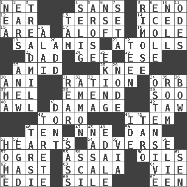 ACROSS 1. Remaining after all deductions 4. Without 8. Western Nevada city 12. Ewer handle 13. Laconic 14. On the rocks 15. Length times width 17. Upward 18. Undercover agent 19. Deli grouping 21. Ringlike coral islands and reefs 23. June honoree 24. Turn to the right 26. Compass dir. 27. Among 28. Leg joint 30. Black tropical American cuckoo 31. Food allowance for one day 34. Globe 37. Cartoonist voice _ Blanc 38. Make improvements or corrections to 39. "Barney Miller" actor Jack 40. Leather borer 41. Break 42. The 23rd letter of the Hebrew alphabet 43. "Corrida" creature 44. A distinct part 46. Nine, plus one 47. Compass dir. 50. One of the 12 tribes of Israel 51. Centers 54. Contrary to your interests or welfare 57. Legendary monster 58. Slender Brazilian palm 60. Lubricates 62. Vertical spar for supporting sails 63. Any of the three canals of the cochlea 64. Compete 65. Singer Brickell 66. Drop; flow; fall 67. Car or cant ending DOWN 1. Teachers' org. 2. Hearing organs 3. Excercise machine 4. Major League Baseball Commissioner Bud 5. Came up 6. Overdraft (abbr.) 7. Stalk of a moss capsule 8. Full of chinks, cracks, or crevices 9. Learning spot: Fr. 10. 1994 drama film starring Jodie Foster 11. Lyric poems 13. Scottish cap 16. Jai ____ 20. Find the sum of 22. Adolescent 25. Supplementing with great effort 27. Afresh 29. Thickened enlargement 30. Housemaid (var.) 31. Bring up, as a child 32. ID or VA city 33. Afternoon social gathering 34. Clearly or manifestly demonstrative 35. Wander aimlessly 36. Ribbon knot 41. Do not 43. Cylindrical with tapered ends 44. Binary compound 45. Pacific island yam 46. Tarsus (plural) 48. Rhinal 49. Peak District village in England 51. Residence 52. Mild oath 53. Backtalk 55. By way of 56. Writer Wiesel 59. _-fi 61. Elected rep.