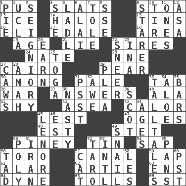 ACROSS 1. Fluid product of inflammation 4. Narrow boards 9. Portico 13. Frozen water 14. Radiant circles of light 15. Airtight sealed metal containers 16. Biblical high priest 17. Peak District village in England 18. Length times width 19. Mature 21. Whopper 22. Founders of families 24. Nathan's nickname 26. Compass dir. 27. Capital of Egypt 29. Lightbulb-shaped fruit 30. Amid 31. Diluted with white 33. Bar bill 36. Armed conflict 37. Responses 40. Wing 41. Like a shrinking violet 42. Toward the sea 43. Bodily heat indicating an inflammation 45. For fear that 47. Stares 48. Eastern Standard Time (abbr.) 49. Proofreading order 50. Abounding in pines 52. Shallow baking pan 54. Plant excrement 56. "Corrida" creature 57. Lessep's creation 59. Pet locale 61. Having or resembling wings 62. Nick name for Arthur 63. Followers of ems 64. Unit of force 65. For Whom the Bell _____ 66. Fast jet (abbr.) DOWN 1. Sliced dessert 2. Southern CA. univ. 3. Signiory (variant) 4. A female animal or person 5. Dipping utensil 6. Jai ____ 7. Lacquered or enameled metalware 8. Compass dir. 9. A viewer who gazes fixedly 10. Become fatigued 11. Washington bills 12. White ___ sheet 20. Merit 22. Contemptuous expression 23. _ tizzy (2 wds.) 25. Ancient Roman robe 27. Crow sounds 28. Housemaid 29. Entreaty 31. Inconspicuous attention getter 32. Deep reverence 33. Baron Munchausen's specialties 34. Medicinal plant 35. Taverns 38. Thoroughly unpleasant 39. Highlander 44. Grows older 45. Poe poem 46. Compass dir. 49. Slow-paced one 50. Much (prefix) 51. SW Asia republic 52. Edible starchy tuberous root 53. International (abbr.) 55. Zero-star reviews 56. Small boy 57. Feline 58. French article 60. Pacific Standard Time (abbr.)