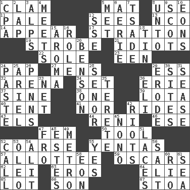 ACROSS 1. Dollar (slang) 5. Floor covering 8. Purpose 11. Light colored 12. Observes 13. Non-commissioned officer (abbr.) 14. Seem 17. Ski resort town in Vermont 19. Disco prop 21. Foolish or stupid persons 22. Not divided or shared with others 23. Car or cant ending 24. Infant food 27. Not women's 29. Double-curved letter 32. Sports stadium 34. Put into a specified state 36. One of the Great Lakes 37. Trig term 38. Single 39. Globular water bottle used in Asia 40. Portable shelter 41. Not either 42. Amusement-park features 43. Raised railways 44. Painter Guido (1575-1642) 46. Compass dir. 47. Opposite of masc. 50. Implement 52. Unrefined 55. Gossips 57. One to whom something is allotted 59. Motion picture awards 62. Luau accessory 63. Greek god of love 64. Writer Wiesel 65. Car dealer's back yard 66. Manchild 67. Portico DOWN 1. Tax preparer (abbr.) 2. Pet locale 3. High mountains 4. Confronts 5. Was introduced to 6. Nest on high 7. Sadhe (variant) 8. To (old English) 9. Highlander 10. Immeasurably long periods of time 12. Compass dir. 15. Odor 16. Hero or heavy, e.g. 18. Metal container 20. Gillaume's butler role 24. Thick mixture 25. Satellite of Uranus 26. Actor Sean's family 28. Sir (Sp.) 29. Wear away 30. Settings 31. Gospel singer Marvin 33. Remaining after all deductions 35. Cylindrical with tapered ends 36. Biblical high priest 42. Disturbances 45. Words to Nanette 47. From 48. _____ Park, CO 49. Paris' subway 51. Shoestrings 52. Give a ring to 53. Margarine 54. Set down 55. It is so 56. Table seasoning 58. Period of immesurable duration 60. River (Sp.) 61. Ocean