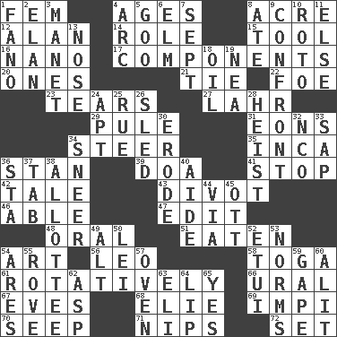ACROSS 1. Opposite of masc. 4. Eons 8. Land measure 12. Actor Alda or Thicke 14. Hero or heavy, e.g. 15. Instrument 16. Billionth: prefix 17. Pieces 20. Washington bills 21. Standoff 22. Enemy 23. Pulls into pieces 27. Cowardly lion portrayer 29. Whimper 31. Immeasurably long periods of time 34. Guide 35. South American Indian 36. Comedian Laurel of Laurel & Hardy 39. ___ good deed 41. Discontinue 42. Lie 43. A piece of turf (Scot.) 46. Competent 47. Prepare for publication 48. Taken by mouth 51. Eroded 54. Tate display 56. Lion 58. Ancient Roman robe 61. Producing rotation 66. Mountain range 67. Nights before holidays 68. Writer Wiesel 69. Body of Kaffir warriors 70. Ooze 71. Pinches, bites 72. Arrange properly for use DOWN 1. Papal veil 2. Liveliness 3. French painter Edouard 4. Curve 5. Thick or sticky substance 6. Shade tree 7. Back-to-school mo. 8. Had dinner 9. Meet 10. Printing process, for short 11. Otherwise 13. Characteristic smell of wine 18. Lubricate 19. Teachers' org. 24. Fitting 25. Sorrow 26. Downhill vehicle 28. Robbery 30. Wear away 32. Non-commissioned officer (abbr.) 33. Plant excrement 34. Contemptuous expression 36. R.R. building 37. Keyboard key 38. One to whom something is allotted 40. Assistant 44. By way of 45. Baseball player Mel 49. Keyboard modifier key 50. Flowery wreath 52. Needle case 53. Typical standards 54. Ancient Greek god of war 55. Be footloose 57. Baking chamber 59. Yawn 60. Set down 62. Viper 63. Biblical high priest 64. Mouth edge 65. It is so