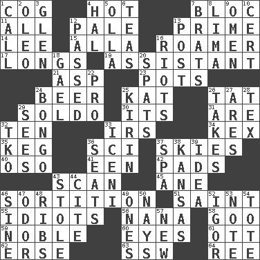ACROSS 1. Gear tooth 4. Being at a high temperature 7. Coalition 11. 100% 12. Diluted with white 13. First class 14. Area sheltered from the wind 15. Silent film actress Nazimova 16. Nomad 17. Yearns 19. Aide 21. Viper 23. Cooking vessels 24. Fermented drink made from hops 25. Krazy ___ of comics 26. Make lace 29. Twentieth part of a lira 30. It is 31. "We ___ not amused" (Victoria) 32. Nine, plus one 33. Big collection agency 34. A weed 35. Barrel 36. _-fi 37. Atmospheres 40. Bear (Spanish) 41. Car or cant ending 42. Writing tablets 43. Examine hastily 45. One (Scot) 46. Making a chance decision by using lots 51. Inhabitant of Heaven 55. Foolish or stupid persons 56. Nanny 58. Thick or sticky substance 59. Impressive in appearance 60. Snake ____ (dice throw) 61. Baseball player Mel 62. Celtic language 63. Compass dir. 64. To riddle DOWN 1. Give a ring to 2. Margarine 3. Small, secluded valley 4. Actor Linden 5. Spanish pot 6. Afternoon social gatherings 7. Naughty children 8. Pale green bean 9. Presage 10. Foregone conclusion 12. Went by 13. Mail 16. Disturbances 18. Highlander 20. Arguments over trivial matters 22. Adept person 24. Beat drum 25. Japanese brewing company 26. Proceeds 27. Ancient Greek god of war 28. John Ritter's dad 29. Perceives with the eye 32. Ring climax 33. Ancient Celtic tribe of eastern Britain 36. Theater features 37. Health resort 38. Sunflower state 39. It may be bright or harebrained 43. Fur scarf 44. Quote 46. Trig term 47. Scent 48. Chest bones 49. Washington bills 50. Negative votes 52. Composer Stravinsky 53. Make mention of 54. Lug 57. ___ Haven, CT