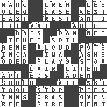ACROSS 1. Drug cop 5. Ship's personnel 9. French article 12. Butter sub 13. Comfort 14. 270 degrees 15. 90 degrees 16. Respite 17. Against 18. Cards in a Roman deck? 19. Large container 21. Satellite of Uranus 22. Raised platform 24. Simpleton 26. Born 27. Giggle 28. The visible part of the earth's surface 29. French philosopher Descartes 30. Verbally 32. Cooking vessels 36. South American Indian 37. _ tizzy (2 wds.) 38. American tennis player Robert 39. Wrote a lyric poem 40. Live dramatic performances 42. Portico 43. Den 44. 61 cubic inches 46. Fitting 49. Begley and Asner 50. An important port of Yemen 51. Tear up 53. Had dinner 54. What Jean-Claude Killy likes to do 57. Utensil 58. Halt 61. Sliced desserts 62. Restaurants 63. Mouths or openings 64. Baking chamber 65. Portuguese money of account (variant) 66. Beget 67. Portable shelter DOWN 1. Christmas carol 2. Mountain range southwest of Kyrgyzstan 3. Home 4. Small bed 5. An absolute certainty 6. Actress Charlotte 7. Curvy letter 8. Dripping 9. Soviet premier 1918-24 10. First name in cosmetics 11. Vertical member of a panel or frame 14. Armed conflict 19. Compete 20. Toward the sea 21. Leather borer 23. Having the leading position 24. A city in N France, SE of Calais 25. Assist 27. Watch over 28. Underwater navigation system 29. River (Sp.) 31. Ms. Damita and namesakes 32. Thick mixture 33. Clearly or manifestly demonstrative 34. Son of Odin 35. Ocean 40. Writing tablet 41. Narrow board 43. Directed 45. Binary compound 46. Moving about 47. Give a jingle 48. Marketplace scale 52. Raised railways 53. Domed church section 55. Peachy ____! 56. Is not 58. Mayday 59. Three (prefix) 60. Boat paddle 61. Plant holder