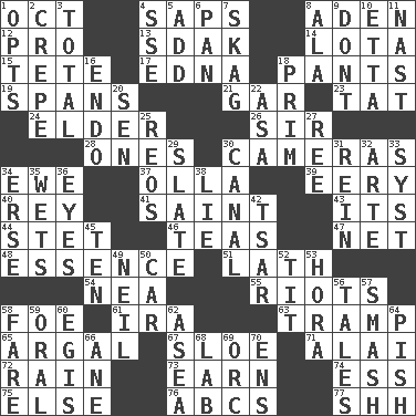 ACROSS 1. Sep. follower 4. Plant excrements 8. An important port of Yemen 12. Adept person 13. Neighbor of Neb. 14. Globular water bottle used in Asia 15. False hair 17. Pulitzer Prize-winning author Ferber 18. Leg coverings 19. Connects, as a bridge 21. Slender fish 23. Make lace 24. A person who is older than you are 26. Title for a knight 28. Washington bills 30. Devices for capturing images 34. She-sheep 37. Rounded earthenware pot or jar 39. Suggestive of the supernatural 40. Marina Del _, California 41. Inhabitant of Heaven 43. It is 44. Proofreading order 46. Beverages made from leaves 47. Remaining after all deductions 48. Gist 51. Thin strip of wood or metal 54. Teachers' org. 55. Debaucheries 58. Enemy 61. Retirement account (abbr.) 63. _____ steamer (cargo ship) 65. Therefore, facetiously 67. A type of plum 71. Mountain range southwest of Kyrgyzstan 72. Precipitation 73. Merit 74. Curvy letter 75. Otherwise 76. Lettered men learn these first 77. Quiet! DOWN 1. Elects 2. Streamer paper 3. "_____ Recall" 4. Compass dir. 5. Find the sum of 6. Baking dish 7. Heroin 8. In the manner of 9. Do not 10. Singer James 11. Political cartoonist Thomas 16. Inside; within (prefix) 18. Demure 20. Elected rep. 22. White ___ sheet 25. Vintage cars 27. To separate or throw off 29. Chalkboard 30. Lessep's creation 31. It's straight from the horse's mouth 32. Johnson of "Laugh-In" 33. System (abbr.) 34. Celtic language 35. Soaks 36. Sight organs 38. Falsehood 42. Russian ruler of old 45. Nine, plus one 49. Famous astronaut Armstrong 50. 4-wheeled motor vehicle 52. Teat (slang) 53. Israeli folk dance 56. Lies 57. Box-office sellout 58. Conductor's collection 59. Of the mouth 60. Armor plate that protects the chest 62. At sea 64. Expression of disdain 66. A saturated hydrocarbon 68. Experiment locale 69. The grampus (Milton) 70. Followers of ems