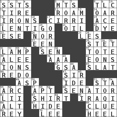 ACROSS 1. Fast planes 5. Mountains (abbr.) 8. Affectionate concern, for short 11. Hoop that covers a wheel 12. Wander 14. Rowing implement 15. Metal shackles 17. High-altitude cloud 18. Adept person 19. Small, flat, pigmented spot on the skin 21. Lubricate 22. Color 23. Compass dir. 24. Not either 25. French article 27. Car or cant ending 28. Proofreading order 31. Desk light 35. Elected rep. 37. Lug 38. Toward shelter 39. Auto club (abbr.) 41. Immeasurably long periods of time 42. Charged particles 43. Girls' org. (abbr.) 45. Narrow board 46. Do over again 47. Title for a knight 49. Cleo's killer 51. Binary compound 52. R.R. building 55. Curve 57. Fitting 60. Legislator 62. Cards in a Roman deck? 63. Upper-body garment 65. Resident of Iraq 66. Keyboard modifier key 67. Flintstone garb 68. A slight indication 69. Marina Del _, California 70. Area sheltered from the wind 71. The bottom of a shoe or boot DOWN 1. Vertical member of a panel or frame 2. Male parents of animals 3. Marketplace scale 4. Posted 5. Medical imaging device (abbr.) 6. "Corrida" creature 7. Indian skirt 8. Inedible or poisonous agaric 9. Made of lace 10. Algonquian 13. Place where flour is made 16. Trig term 17. Pupil covering 20. Leaves 26. _____ Park, CO 29. Inactive volcano in Sicily 30. Trial 31. Den 32. _ vera 33. Ananias' fault 34. Mexican monetary units 36. Tired old horse 40. Aid 44. Helper 48. Painter Guido (1575-1642) 50. Romantic infatuation 52. Showing deterioration from age 53. Woman's close-fitting hat 54. Satellite of Uranus 55. Having or resembling wings 56. Cause heat under the collar 58. Silvers or Donahue 59. Event that recurs at intervals 61. Bowlike part 64. To riddle