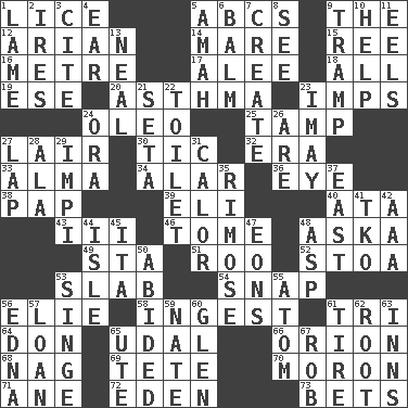 ACROSS 1. Louse (plural) 5. Lettered men learn these first 9. Definite Article 12. Believer in; advocate of (suffix) 14. Female horse 15. Portuguese money of account (variant) 16. Distance measurement (Brit.) 17. Toward shelter 18. Everything 19. Compass dir. 20. Respiratory problem 23. Naughty children 24. Butter sub 25. Pack (down) 27. Den 30. Nervous spasm 32. Period 33. _ mater 34. Having or resembling wings 36. Sight organ 38. Infant food 39. Biblical high priest 40. "One Day ___ Time" 43. One more than two 46. Heavy book 48. "____ silly question..." 49. R.R. building 51. Friend of Pooh 52. Portico 53. Thick slice 54. Fastener 56. Writer Wiesel 58. Consume 61. Three (prefix) 64. Spanish title 65. Allodial 66. Greek mythologigal hunter 68. Tired old horse 69. False hair 70. Person of subnormal intelligence 71. A saturated hydrocarbon 72. Locale of original sin 73. Stakes DOWN 1. Unable to walk 2. Angers 3. Quote 4. Ewer handle 5. Nanny 6. Lip ointment 7. Cause to be 8. Perceive with the eye 9. _____ steamer (cargo ship) 10. Assist 11. Snakelike fish 13. Be tempered by heat 21. Bristle 22. Bathroom plumbing fixture 23. "If ____ say so..." 24. Mouth or opening 26. "We ___ not amused" (Victoria) 27. Infant locale 28. Chicken ___ king 29. Body of Kaffir warriors 31. Bodily heat indicating an inflammation 35. Full of chinks, cracks, or crevices 37. 90 degrees 41. Ring climax 42. American Automobile Association (abbr.) 44. Small island 45. Call ___ day 47. Immeasurably long periods of time 48. Cleo's killer 50. Stayed 53. Burn superficially 55. Tiny particle 56. Pulitzer Prize-winning author Ferber 57. Grant temporary use of 59. Nathan's nickname 60. Small, secluded valley 61. Become fatigued 62. Carrot, for example 63. Lodging establishments 65. Shoshoni 67. Director Reiner